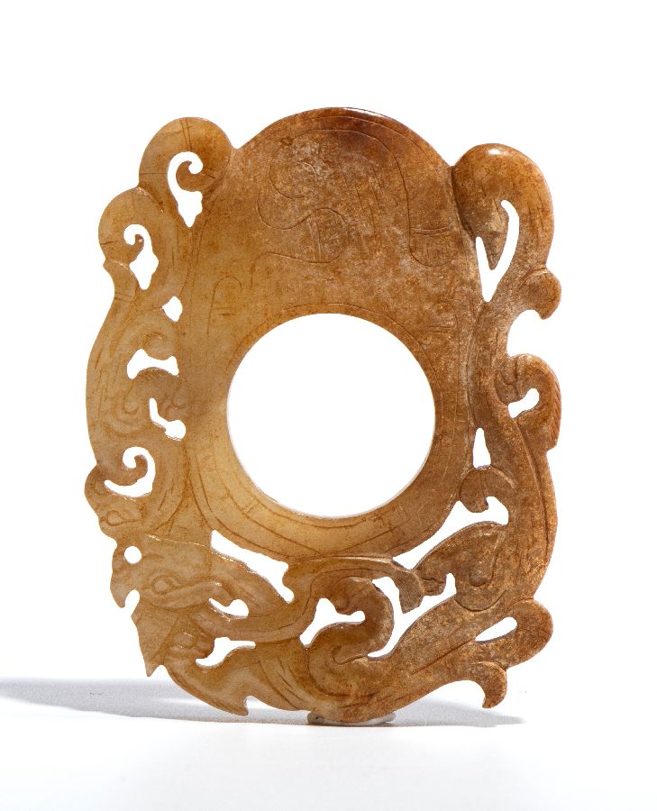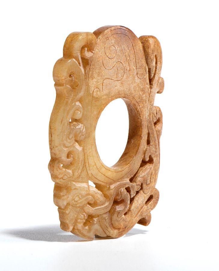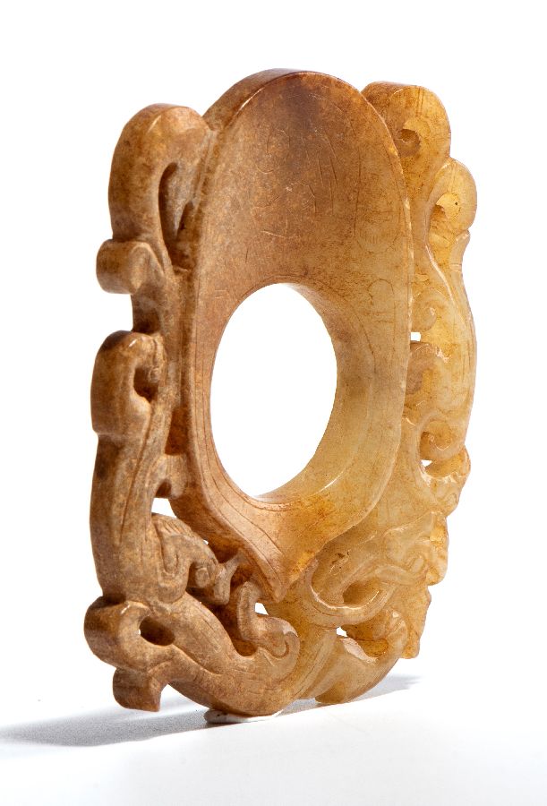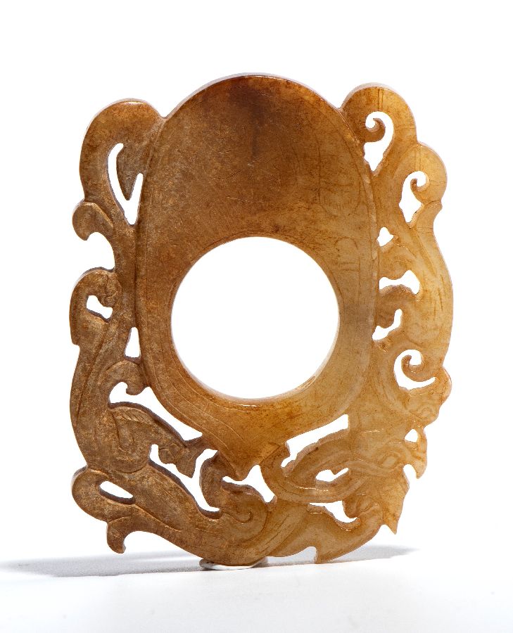 Ornamento pendente in giada dal colore gialla chiara lavorata a traforo, decorato con draghi arcaici.