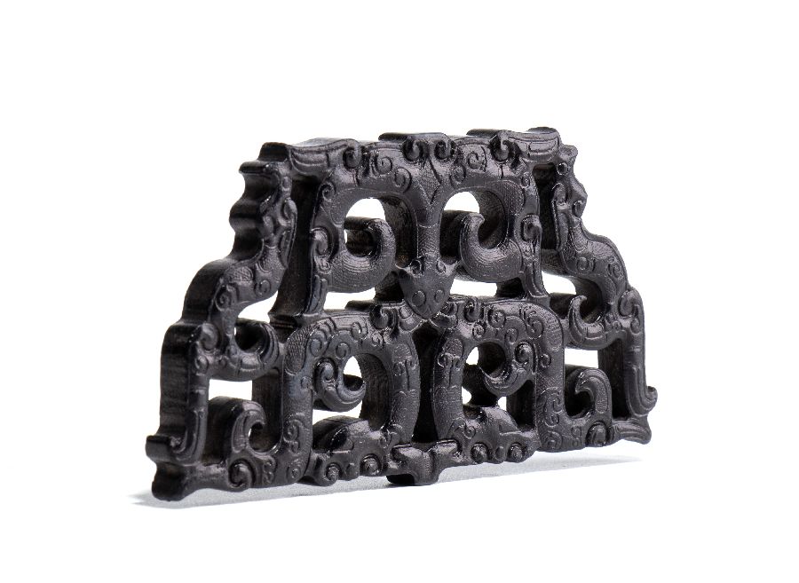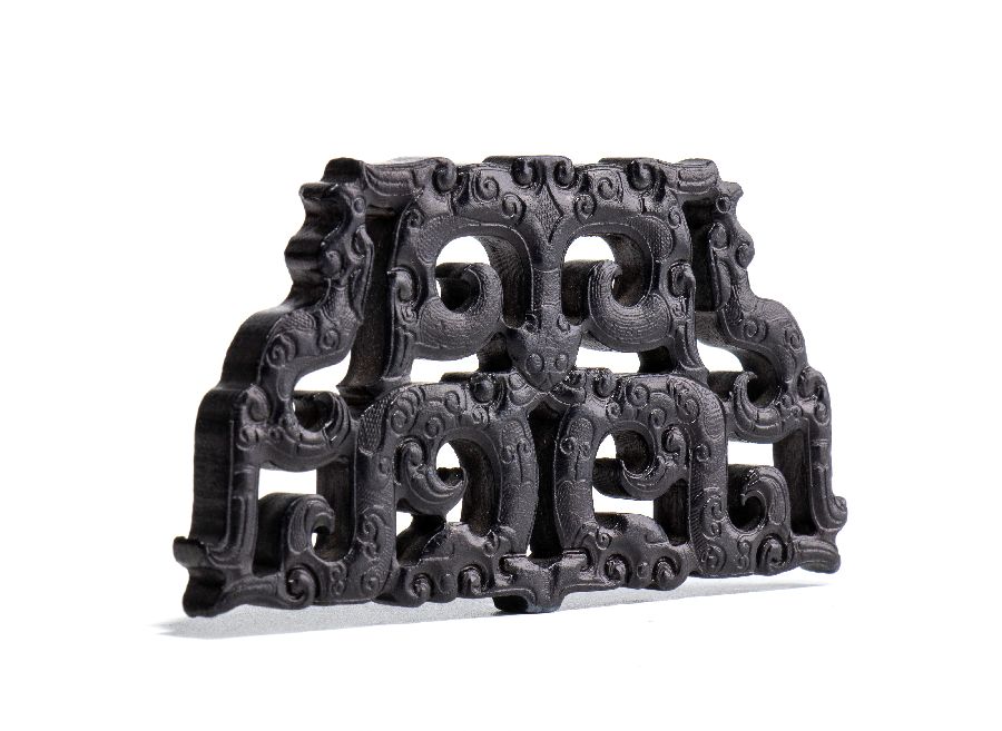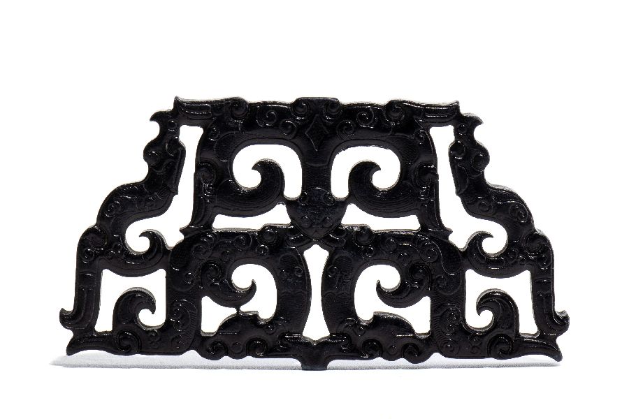 Placca in giada scura lavorata a traforo con decoro di draghi arcaici in stile della dinastia Han (206a.c-220D.c).