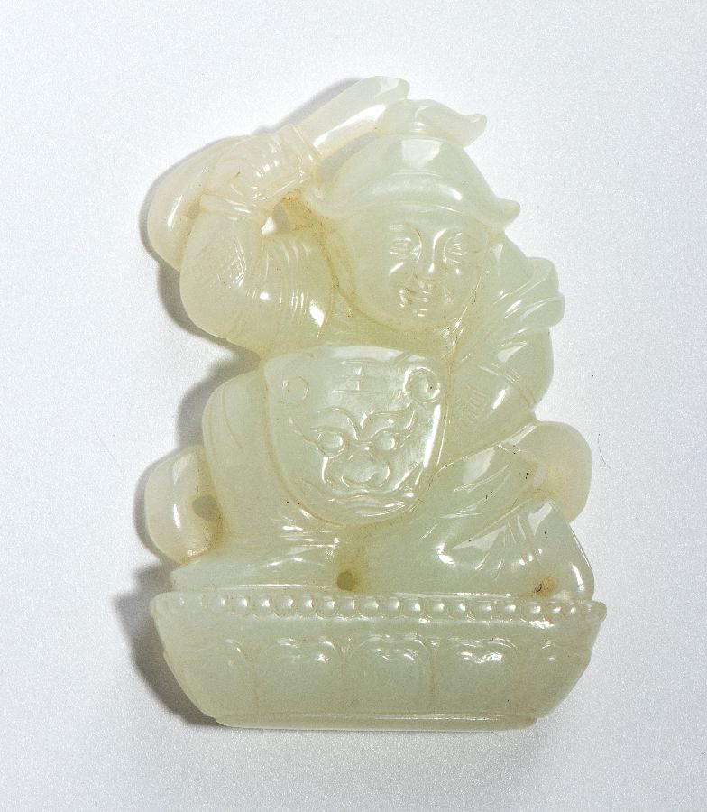 Placca in giada bianca raffigurante un  militare di alto rango.Il significo è il superamento degli ostacoli per raggiungere il successo.