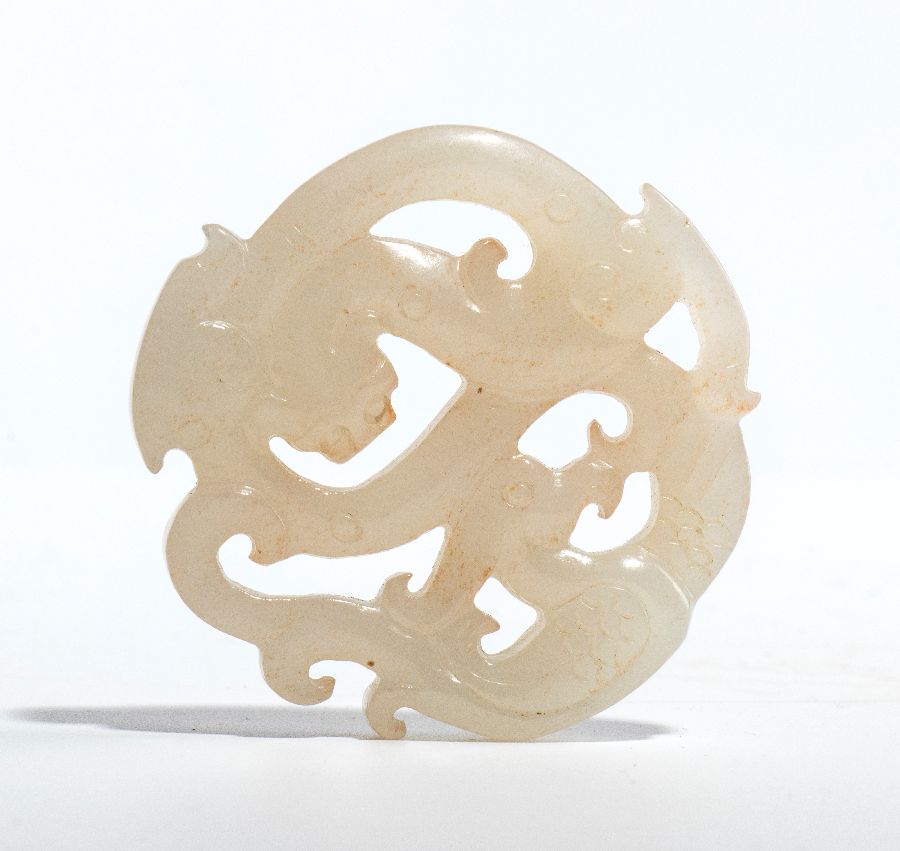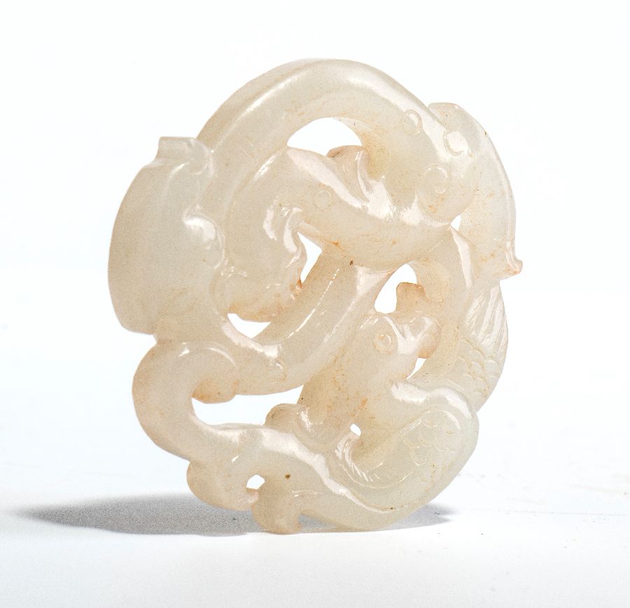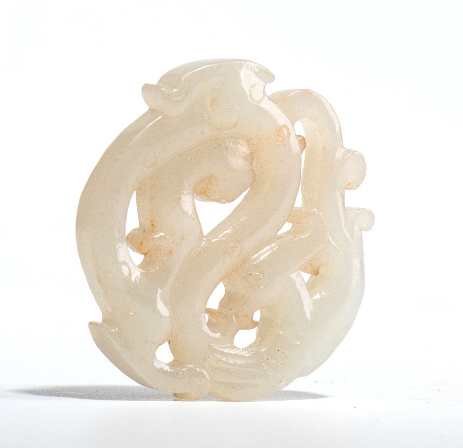 Ornamento pendente lavorato a traforo con decoro a forma di drago.