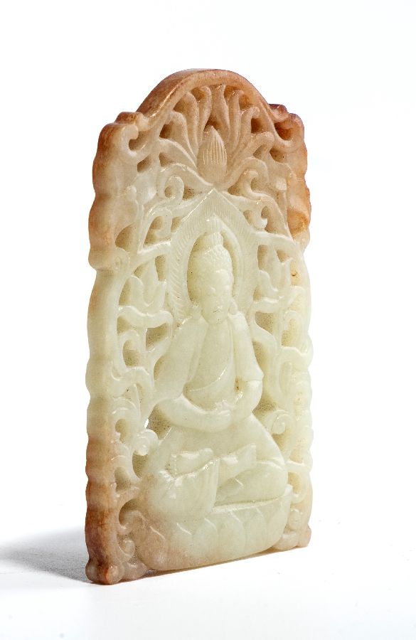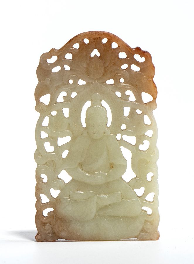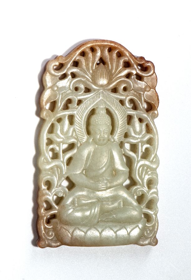 Placchetta in giada lavorata a traforo, con raffigurazione di Buddha.