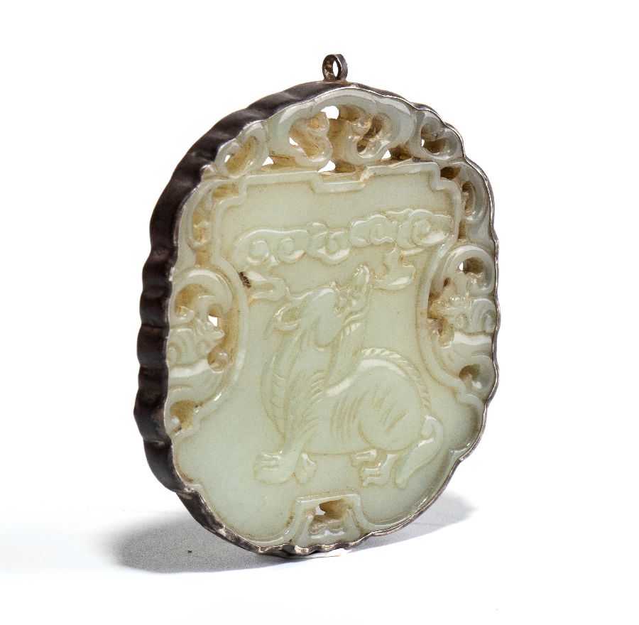 Placca di giada lavorato a traforo, decorato con la creatura mitologica Qilin e "loto d'acqua" (莲花根茎) sul retro, che simboleggia la buona sorte e il doppio auspicio.