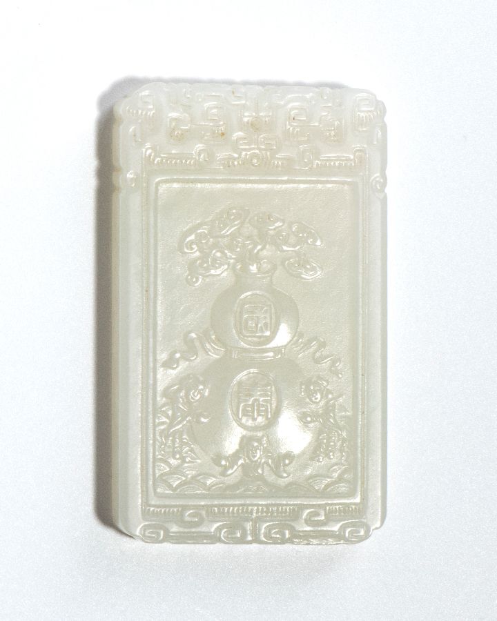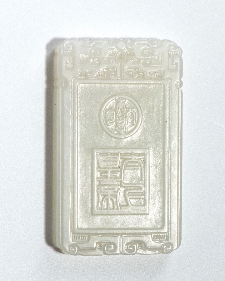 Placchetta rettangolare in giada bianca decorata a leggero rilievo con il tema "Fu Lu" (che significa Benedizioni e Prosperità). Sulla faccia anteriore sono incise le due parole "Guo Tai" (Nazione Pacifica), mentre sulla faccia posteriore appaiono le frasi "Tian En Ba Xun" (Grazia Celeste per Ottanta Anni) e "Tai Shang Huang Di" (Imperatore Supremo).