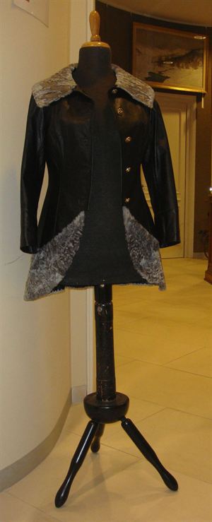 GHERARDINI Giacca in pelle sancrata e foderata con collo e bordo finale in astracan grigio, cinque bottoni gioiello, senza tasche, anni '70 Tg. S GHERARDINI 1970's fitted black leather jacket with, 5 jeweled button and gray astracan trim on collar and cuffs size: S