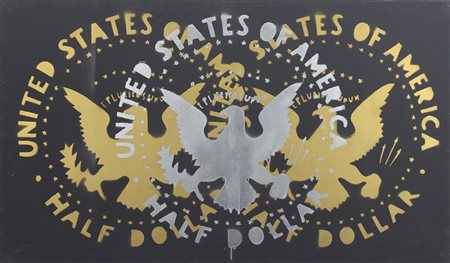 Angeli Franco Half Dollar smalto e acrilico su tela, cm. 70x120 firmato al retro, timbri della galleria Il Castello di Adria al retro, certificato della Collezione Livio Collina di Bologna su fotografia senza cornice