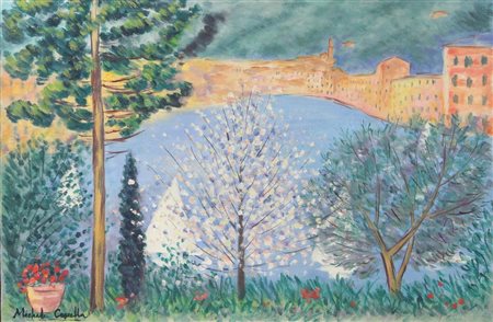 Cascella Michele Portofino, 1981-84 ca. olio su tela, cm. 40x60 firmato in basso a sinistra, firmato per autenticità al retro, certificato di autenticità dell'artista su fotografia, certificato di archiviazione dell'Archivio Generale dell'Opera di Michele Cascella a cura della Torcular di Milano datato 26 Aprile 2011, certificato di autenticità della Telemarket datato 20 Novembre 2010