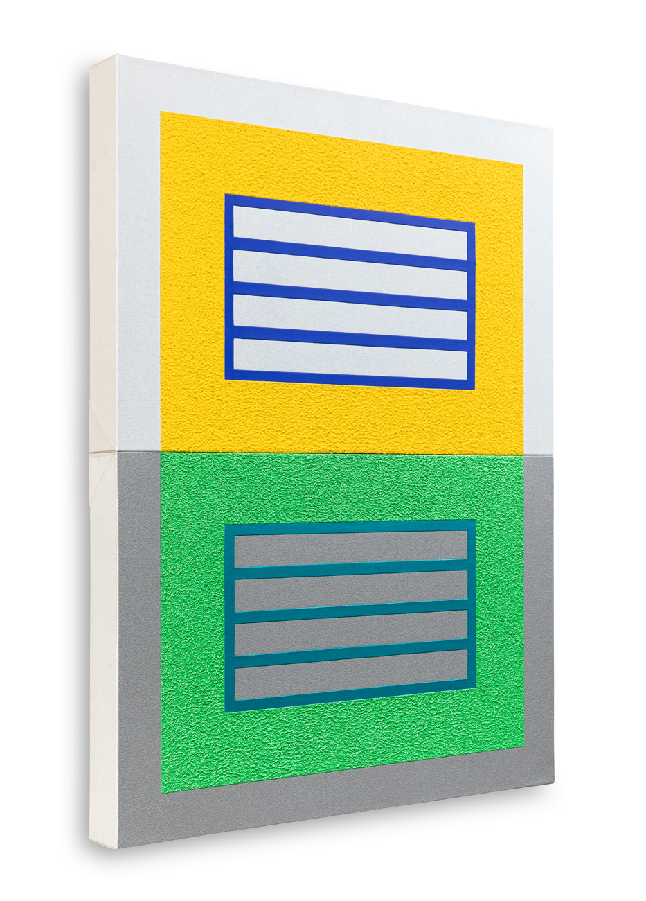 Acrilico, acrilico metallico, acrilico perlescente e Roll-a-Tex su dittico di tele assemblate