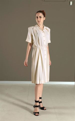 YSL LINEA RIVE GAUCHE Abito fresco lana color panna a manica corta, apertura sul davanti e pieghettato sulla gonna, anni '80 Tg. 42 YSL / RIVE GAUCHE 1980's Cream light weight wool, short sleeved dress with front opening and gathered skirt Italian size: 42