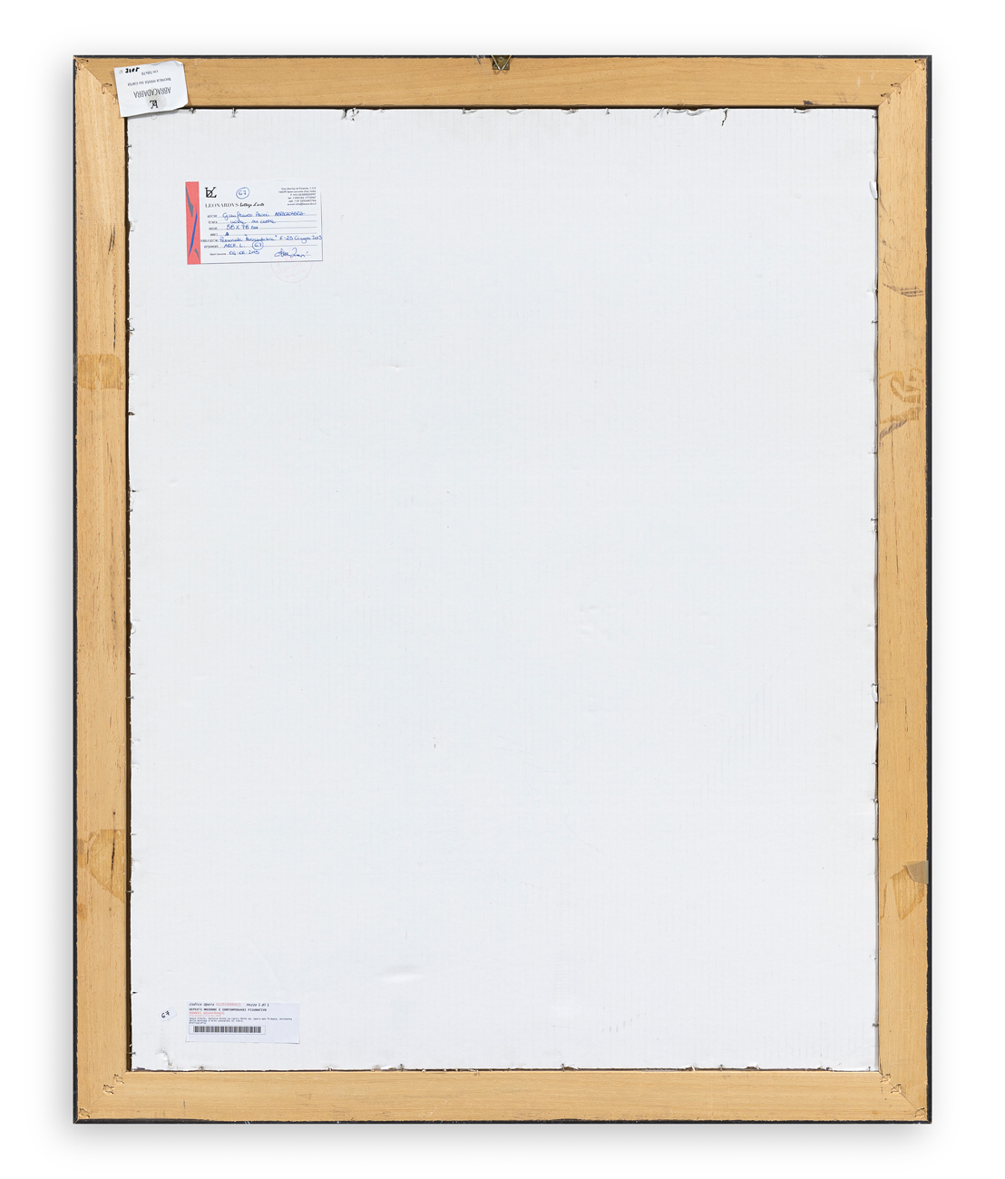 Etichetta della Bottega d'Arte Leonardvs (GE), con caratteristiche tecniche dell'opera, al retro