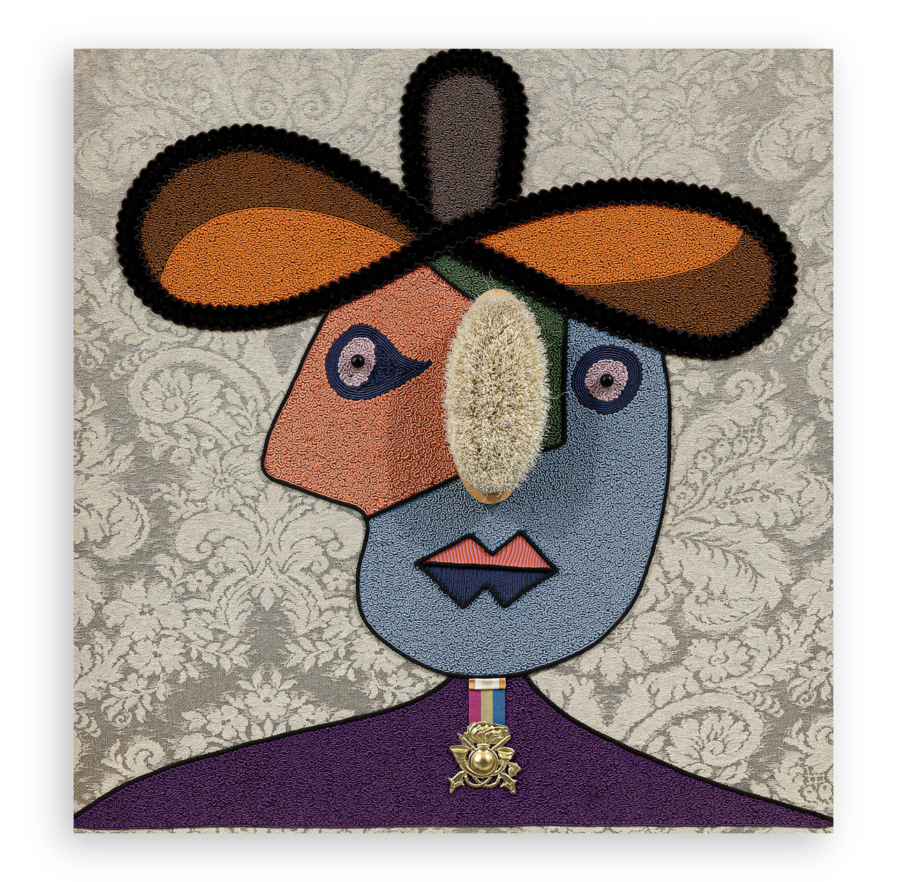 Ricamo in seta e collage su damasco supporto tavola