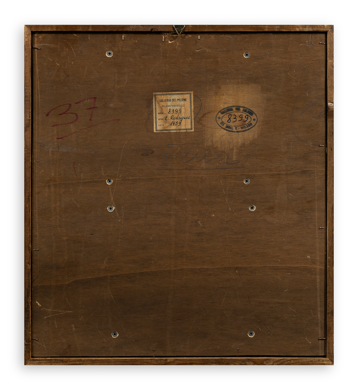 Etichetta e timbro della Galleria del Milione (MI), con relativo numero di inventario, al retro della tavola protettiva