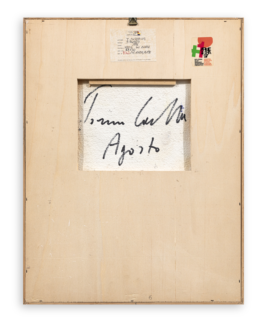 Etichetta della Galleria Astuni (PS), con caratteristiche tecniche dell'opera, al retro