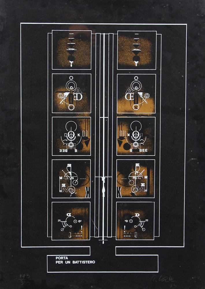 Anonimo Porta per un Battistero, 1973 multiplo su carta , cm. 55x73, es. 143/333 firma non decifrata e data in basso a destra, timbro a secco Galleria d'Arte Cortina di Milano in basso a destra