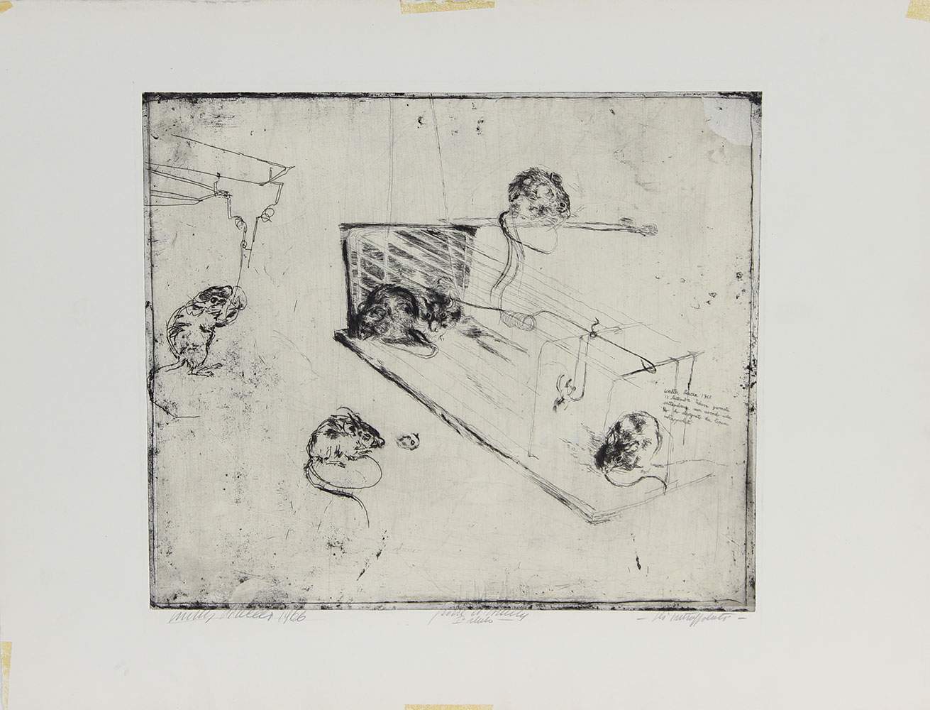 Piacesi Walter Topolini intrappolati, 1966 incisione su carta, cm. 47x61 (lastra cm. 34x39) firmata e datata in basso a sinistra, i margini presentano segni di nastro adesivo senza cornice