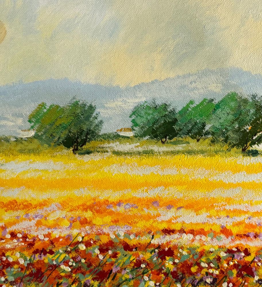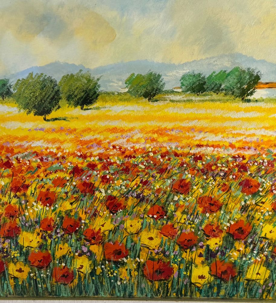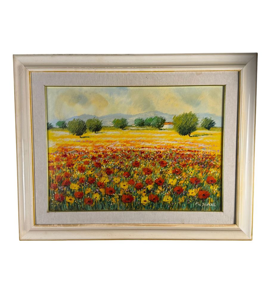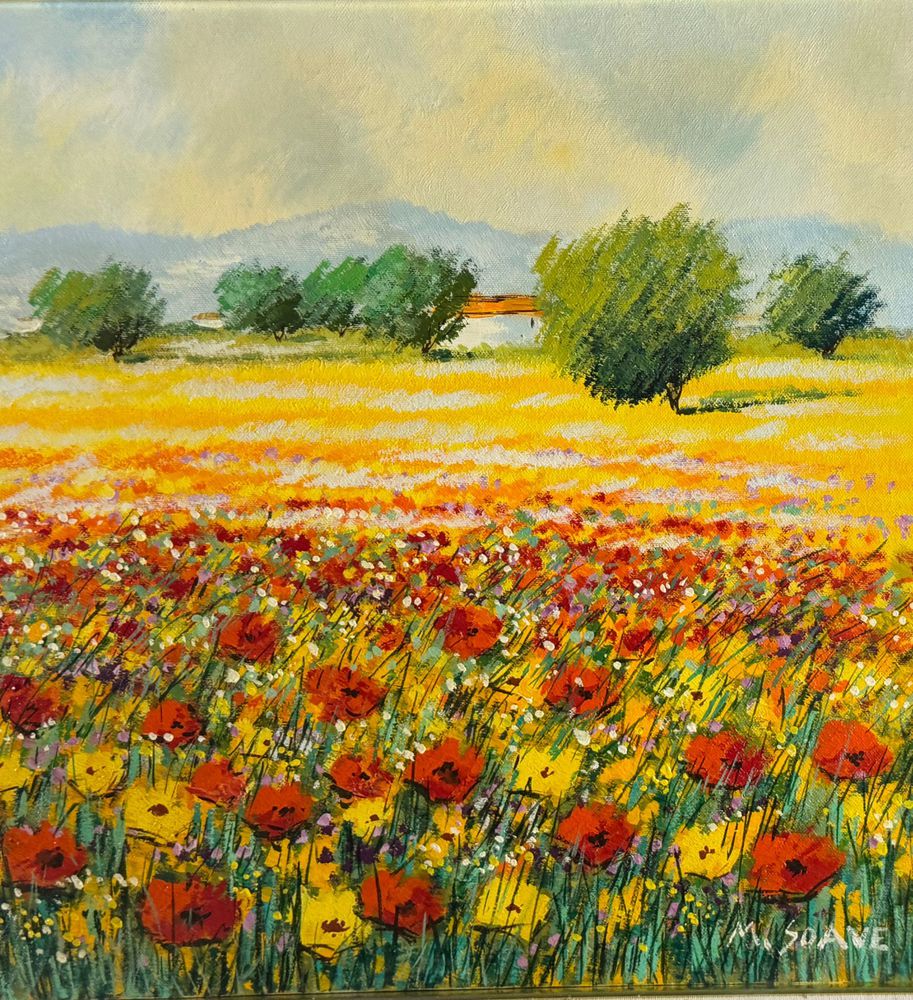 Dipinto olio su tela, periodo XX secolo, scuola Italiana, raffigurante Paesaggio con campo fiorato. Dimensioni compreso cornice: 74x94 cm. Dimensioni interno cornice: 50x70 cm. Firmato in basso a destra Mario Soave (1955 -). Opera in buone condizioni.