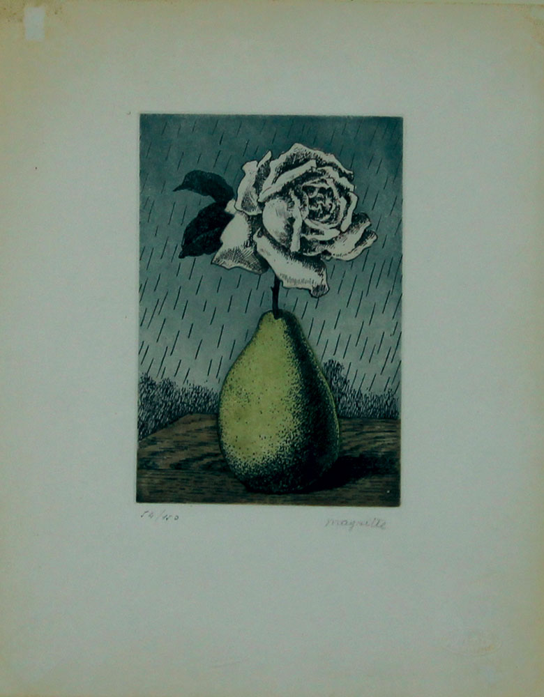 Magritte René Pera e Rosa acquaforte e acquatinta su carta, cm. 28x23 (lastra cm. 15,9x10,8), es. 54/150 firmata in basso a destra, timbro a secco "Gravure Originale Atelier René Magritte"
