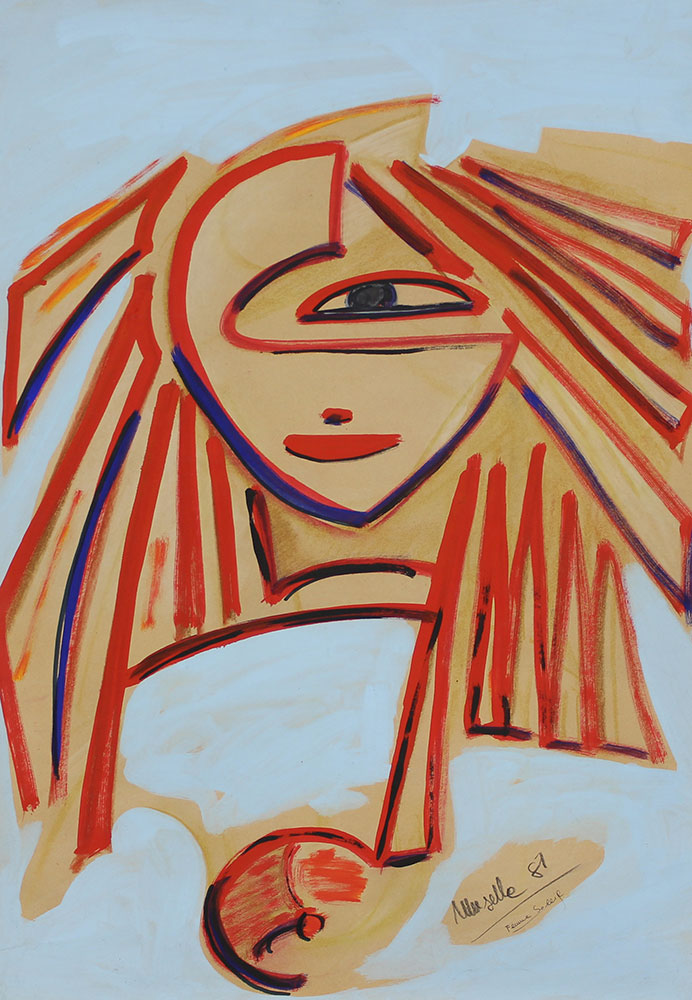 Musella Antonio Femme - Soleil, 1987 tecnica mista su carta, cm. 70x50 firmata, datata e intitolata in basso a destra, certificazione su fotografia della Galleria Arte Spiga di Milano senza cornice