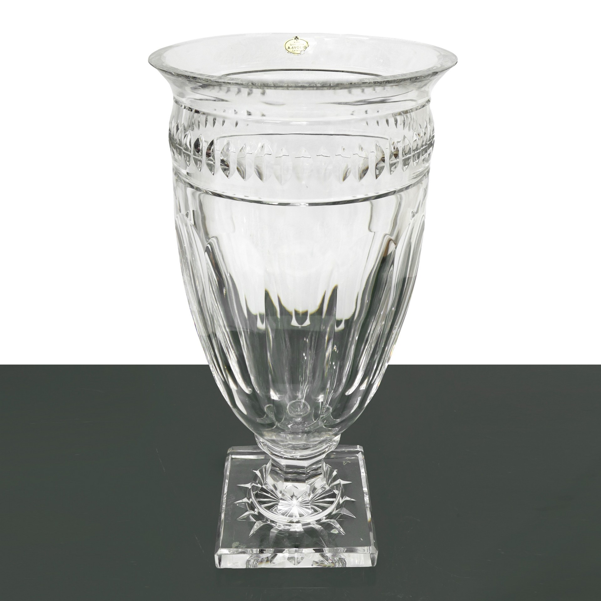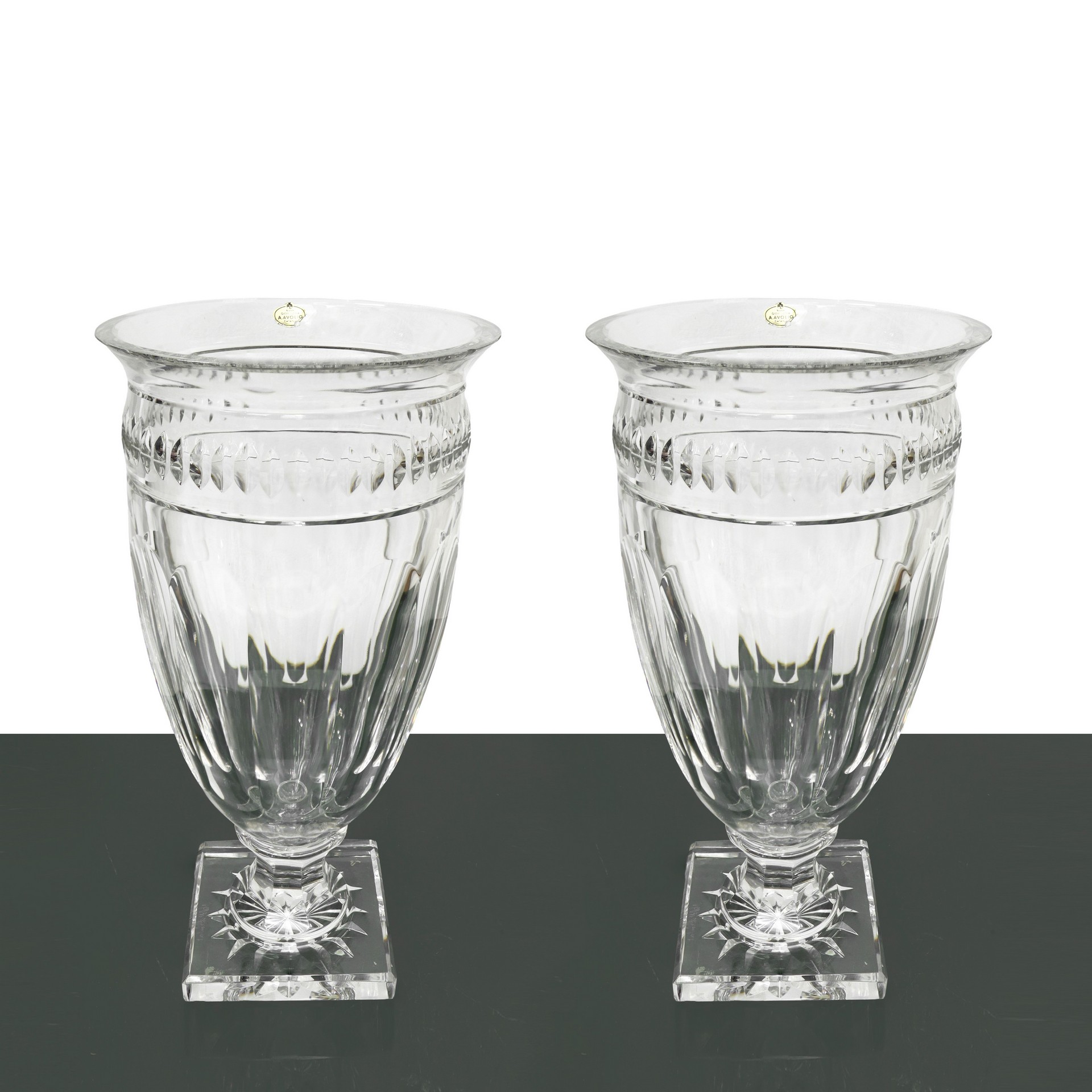N° 2 vasi in cristallo Val Saint Lambert h cm 35,5. Base cm 12 x 12 Piccola sbeccatura sul bordo di entrambi.