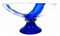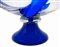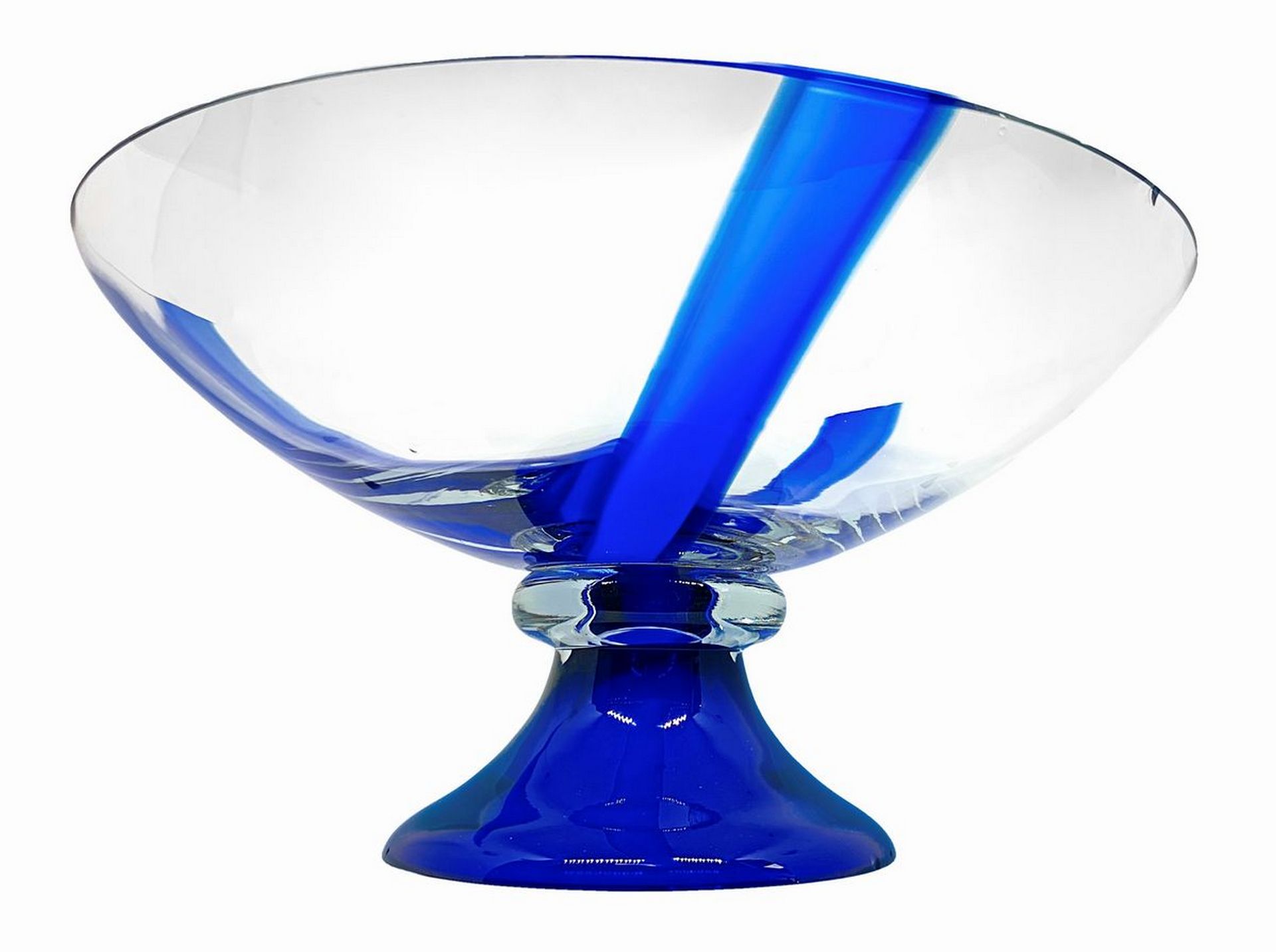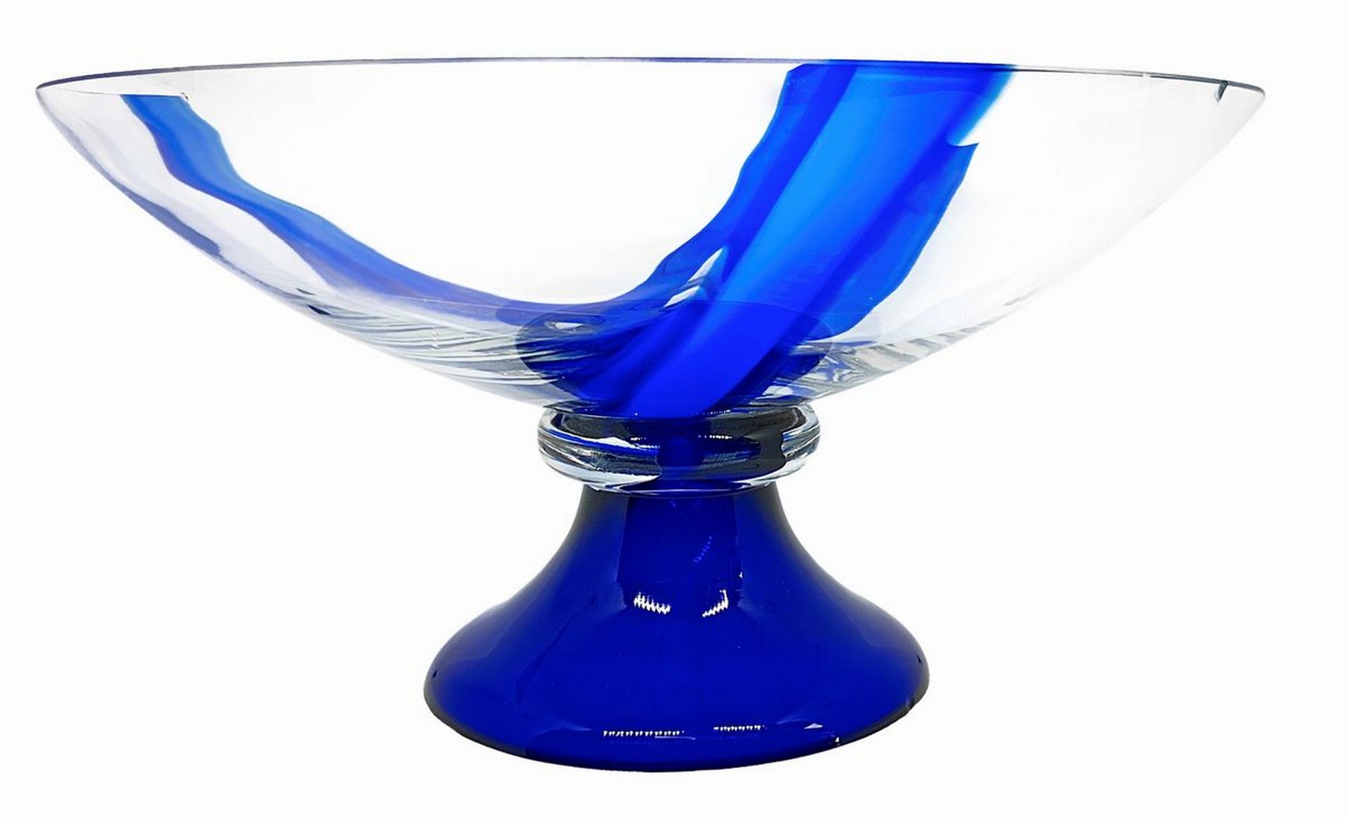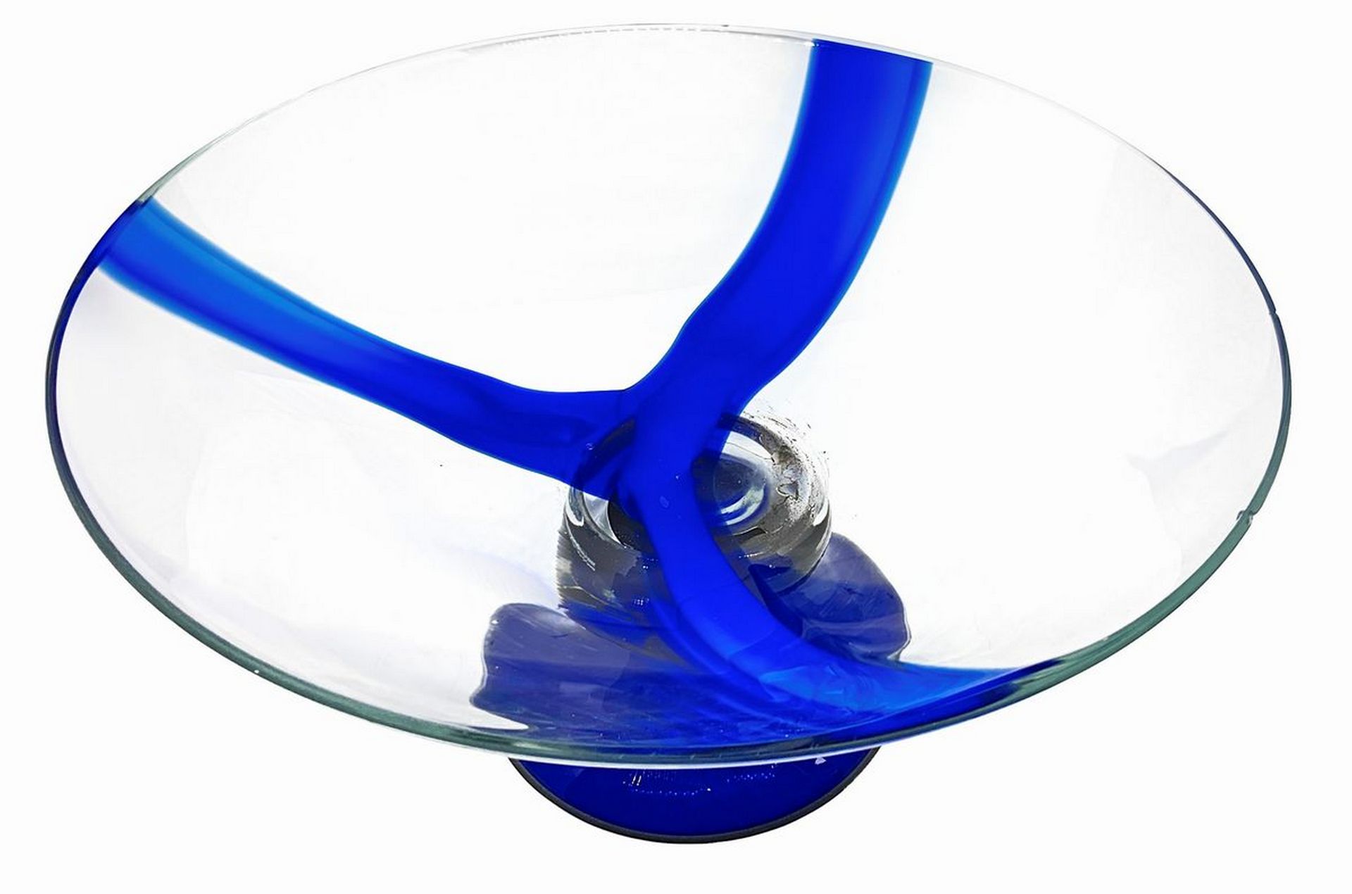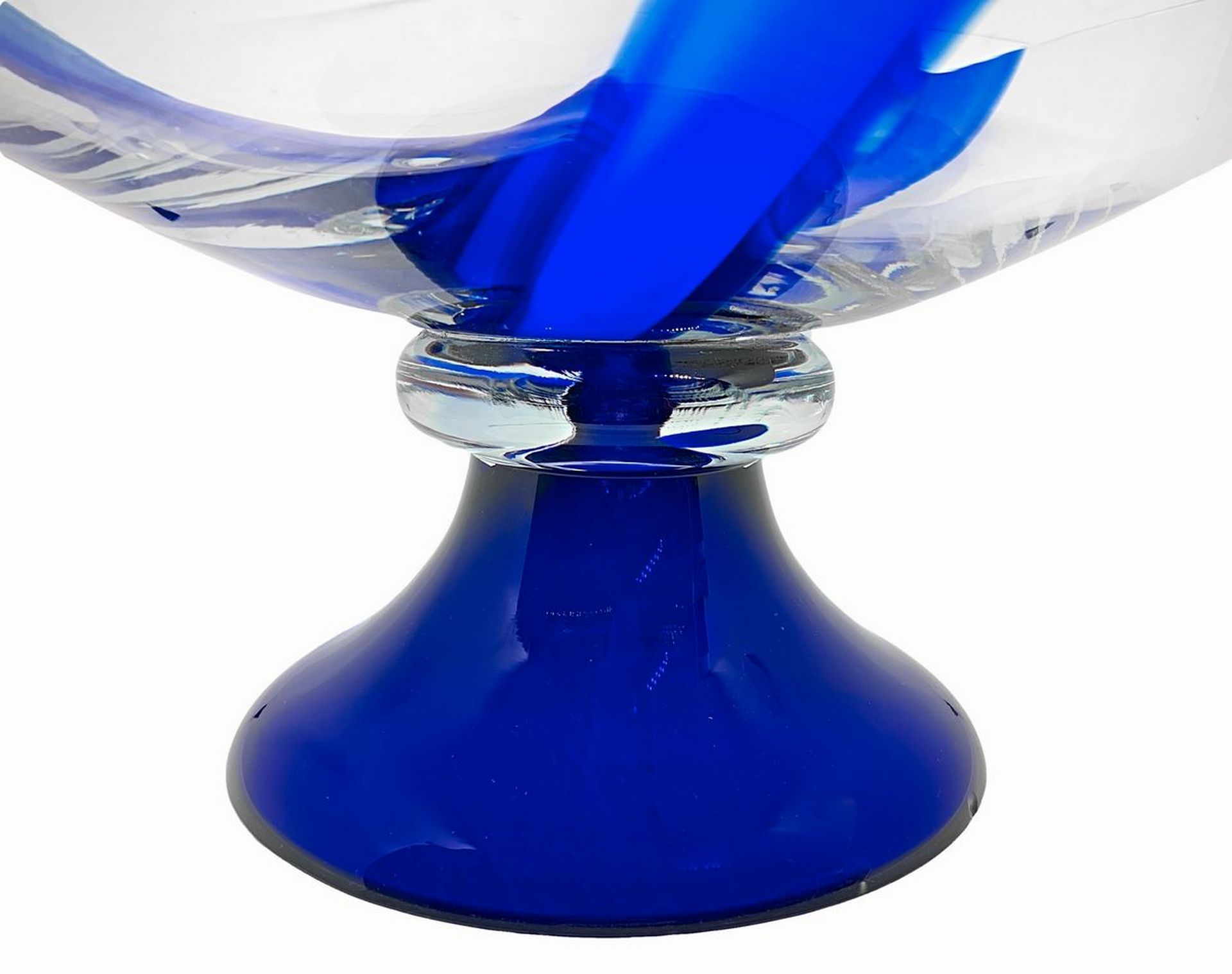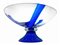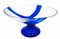 Grande alzata in vetro con base blu e coppa trasparente con inclusione di fasce blu.