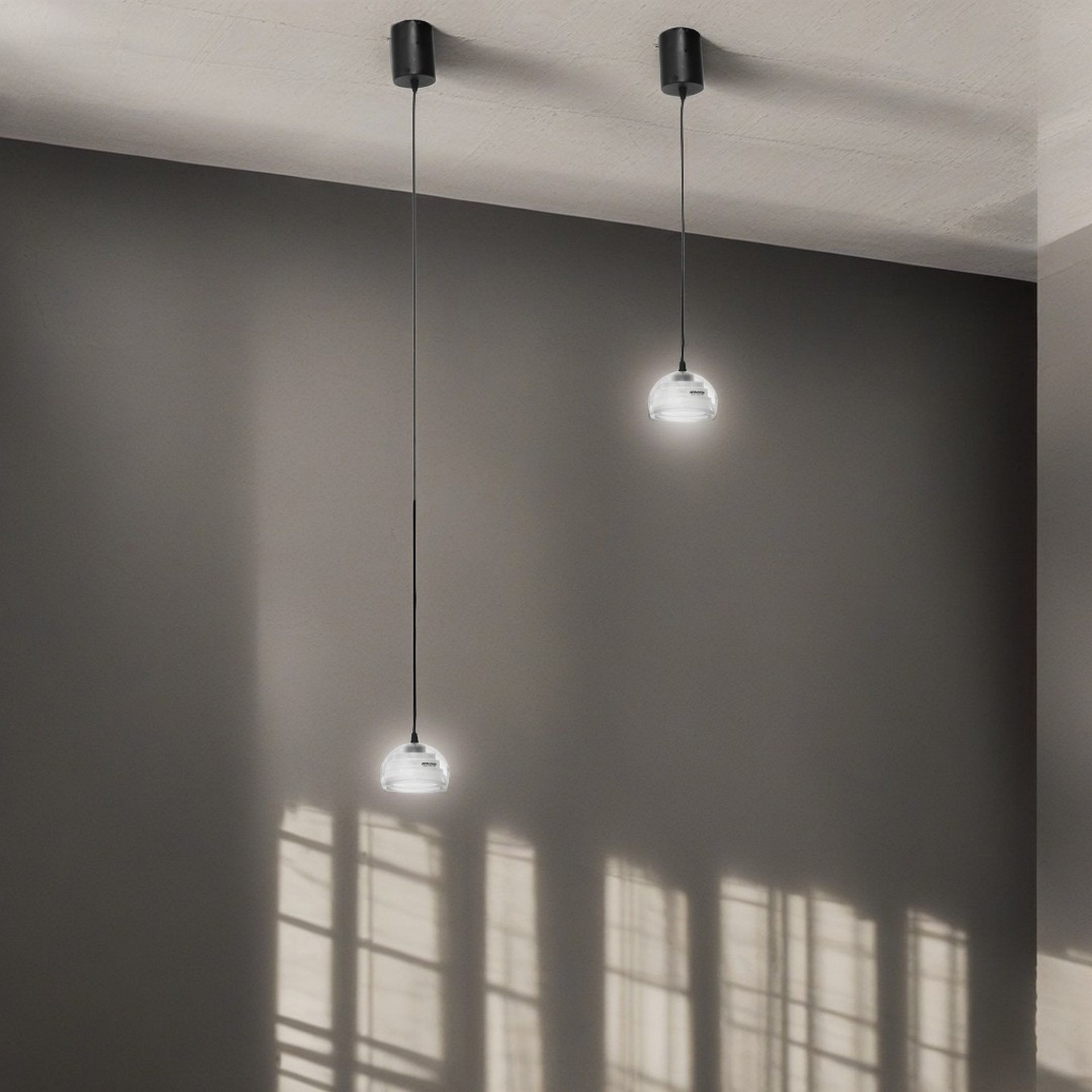 Archimede Seguso (Murano 1909 - Murano 1999) - Coppia di lampade a sospensione diffusore in vetro pesante trasparente e bianco H cm 72,5 - H cm 160 diametro diffusore12,5