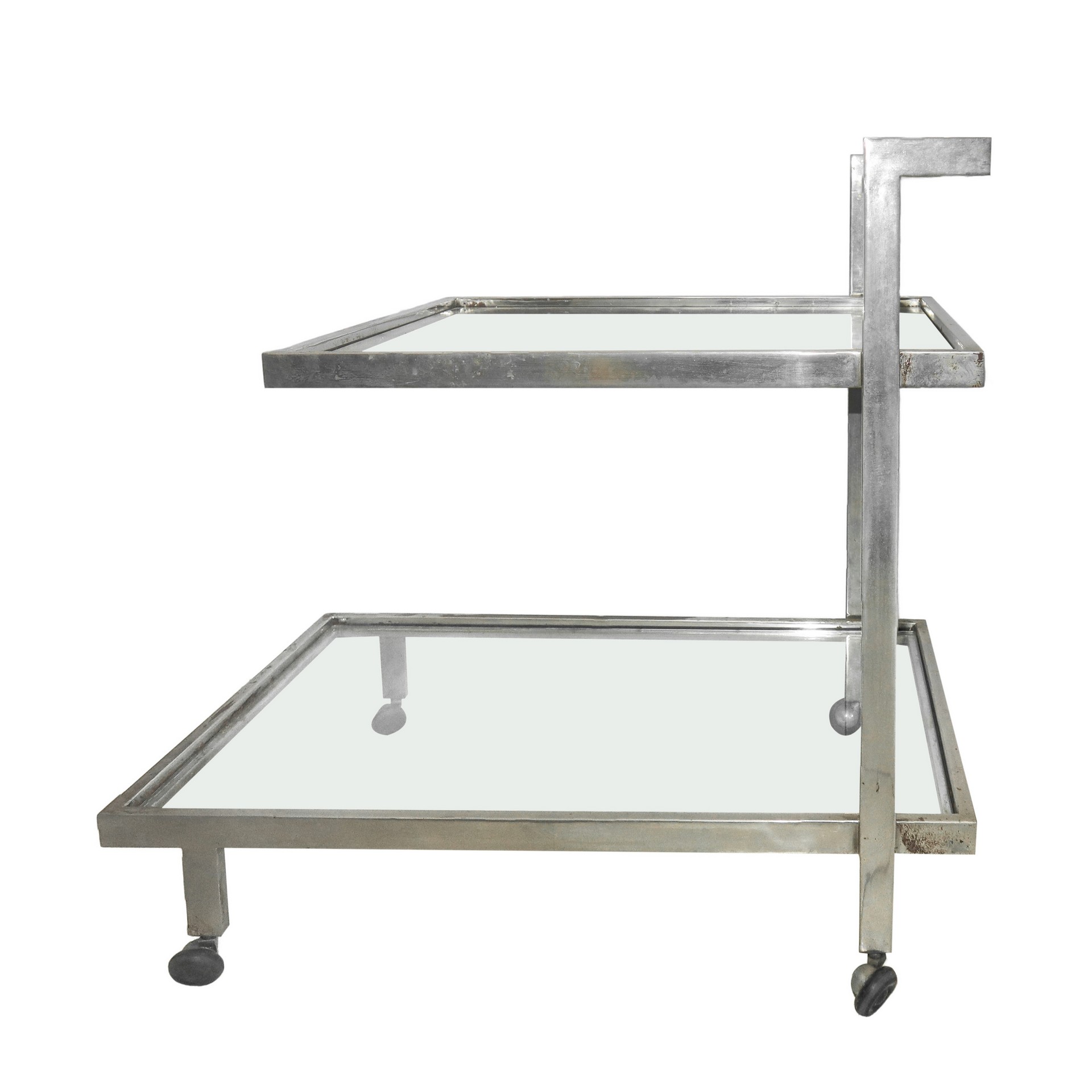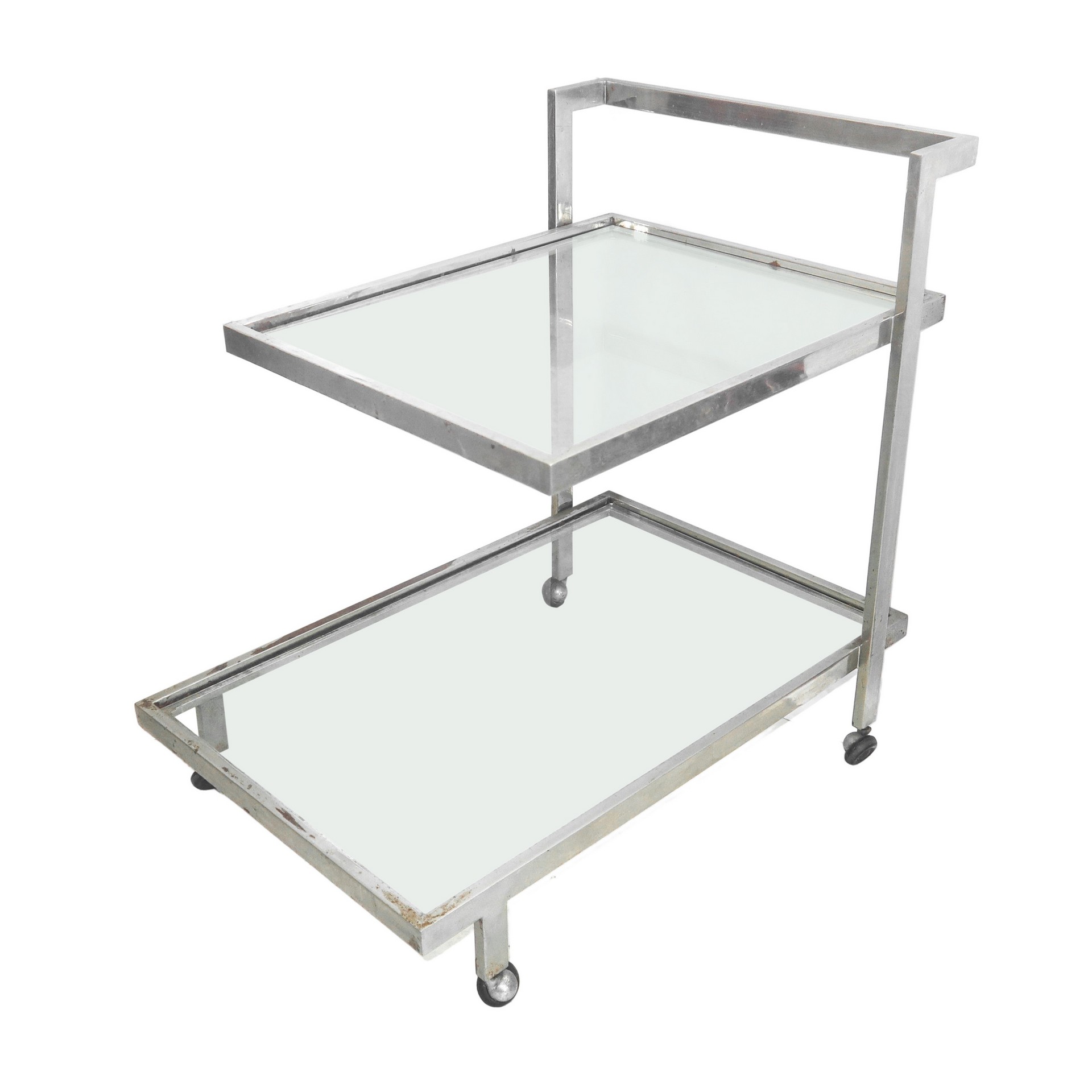 Carrello a due piani con struttura in metallo argentato e piani in vetro H cm 72x76x48 Presenti segni d'uso e segni di ruggine.