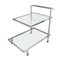 Carrello a due piani con struttura in metallo argentato e piani in vetro
