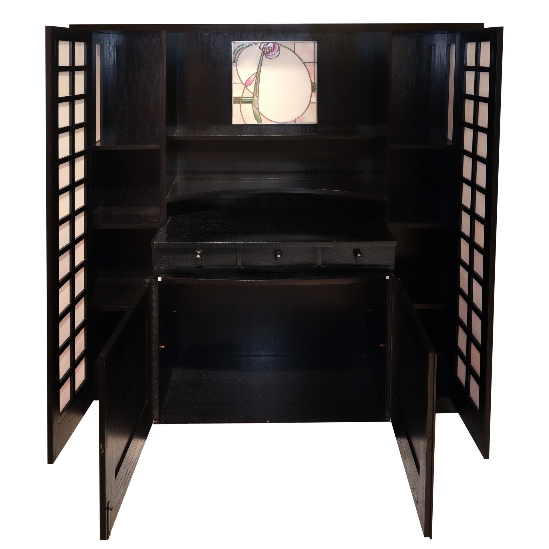 Charles Rennie Mackintosh per Cassina (Glasgow 1868 - Londra 1928) - Credenza in frassino nero con vetro piombato con decoro floreale centrale, 1975 h cm 160X170X55