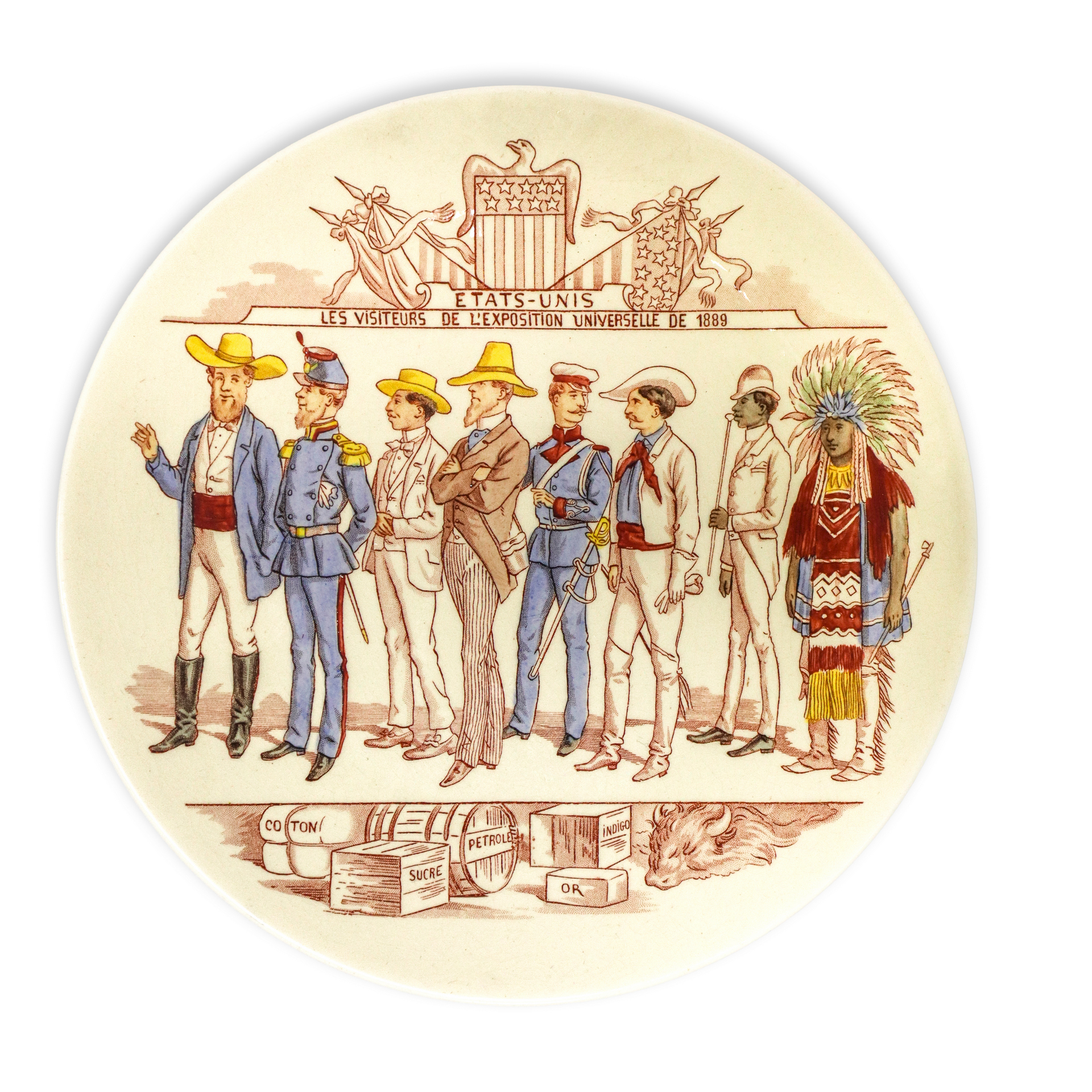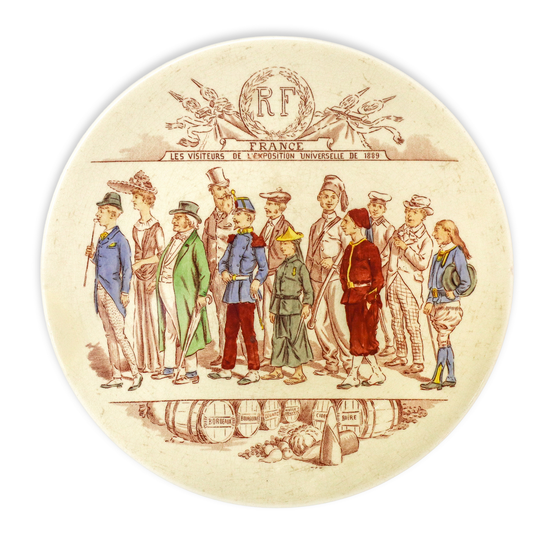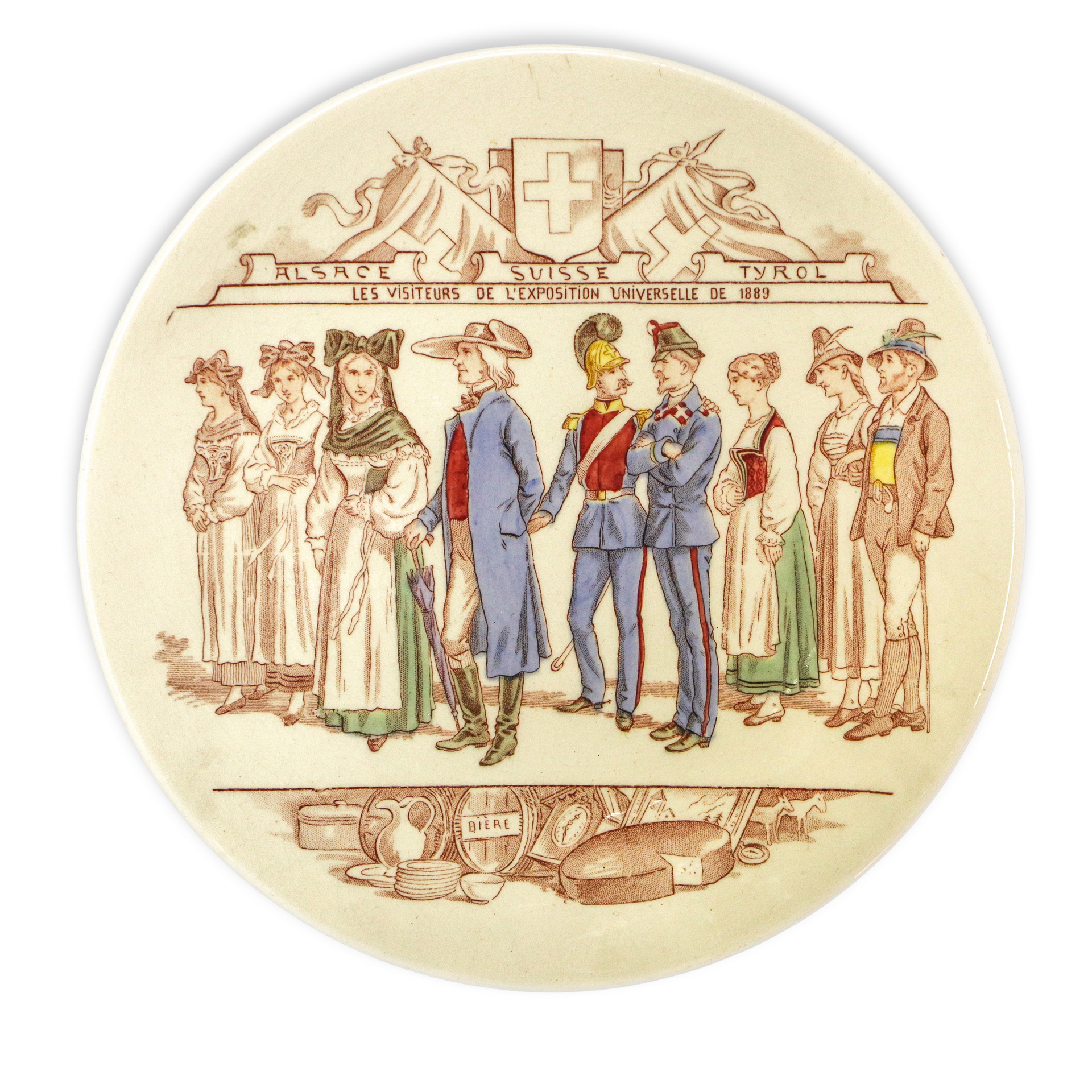 Sarreguemines (Sarreguemines 1790 - 2007) - 10 piatti decorativi da muro "Les Visiteurs de l'exposition Universelle de 1889" in ceramica Sarreguemines Set di dieci piatti sull'Esposizione di Parigi del 1889 che rappresenta le Nazioni e regioni in visita a Parigi per l'Esposizione, tra cui Francia, Stati Uniti, Russia, Inghilterra, Alsazia, Svizzera, Giappone, tutte vestite con abiti e copricapi tradizionali. archio della manifattura per Sarraguemines. Francia, 1888-1889.