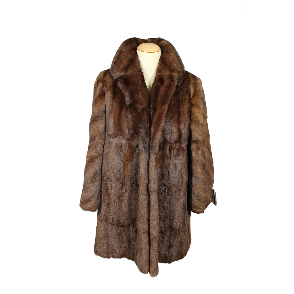 PELLICCIA DI VISONE marrone rossiccio, modello lineare con collo morbido, fodera in raso puntinato, minimi segni d'uso. Italia anni 70 ca h cm 97 x 50