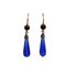 COPPIA DI ORECCHINI PENDENTI in oro giallo 18 kt. Montati con gocce sfaccettate in vetro blu cobalto e piccoli cabochon sculi con montatura a capsula . Chiusura a monachella Italia anni 70