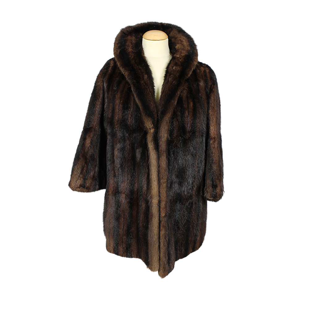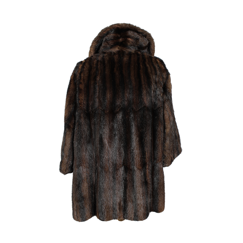 PELLICCIA DI CASTORINO LAVORATO marrone con venature più' scure, modello lungo con cuciture verticali, fodera interna rossa. Segni d'uso. Italia anni 70 ca h cm 110 x 50