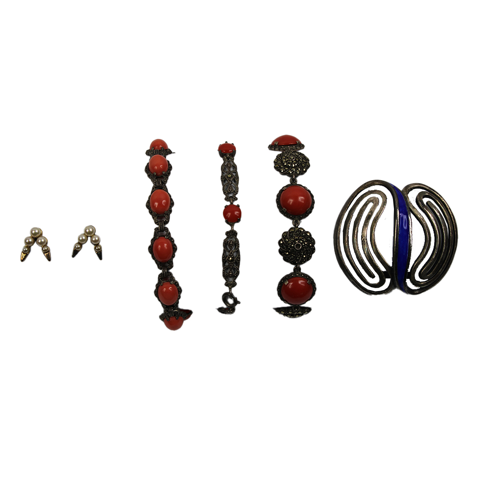 LOTTO DI BIGIOTTERIA VARIA COMPOSTA DA 4 collane 3 bracciali 1 coppia di orecchini e 2 ciondoli a forma di pesce e 1 spilla xx secolo diverse provenienze misure varie