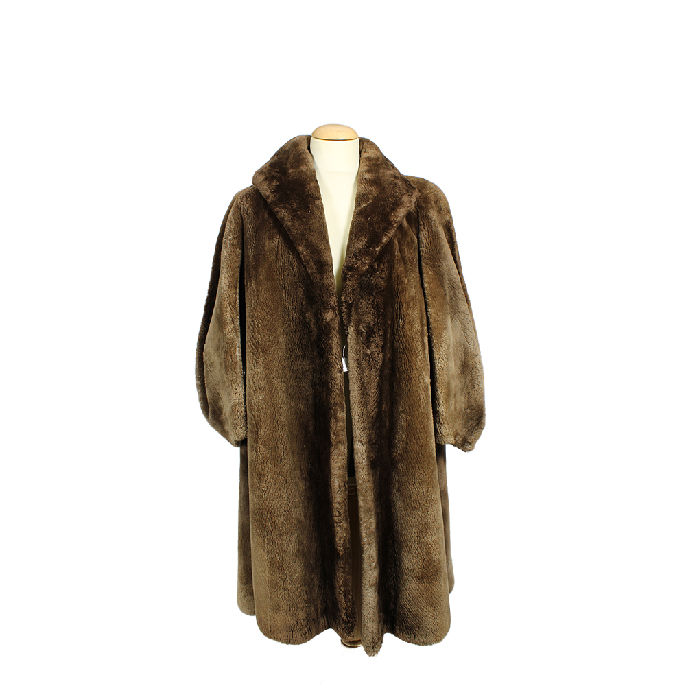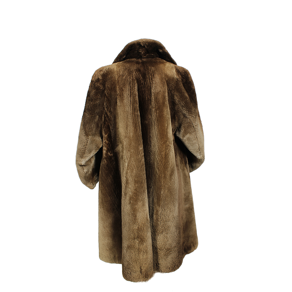 AMPIA PELLICCIA DI CASTORINO RASATO colore marrone medio con riflessi caldi, fodera interna decorata. Normali segni d'uso. Italia anni 70 ca h cm 114 x 50