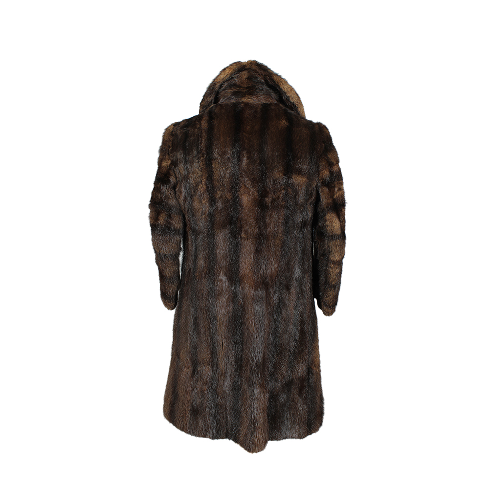 CAPPOTTO LUNGO IN VISONE FEMMINA NATURALE lavorazione con inserti con bande orizzontali, bottoni originali in resina dorata, collo a reverve. Fodera interna in raso marrone con etichetta della pellicceria Gentile Enzo Palermo. Buone condizioni generali. Italia anni 70/80 circa h cm 113 x 47