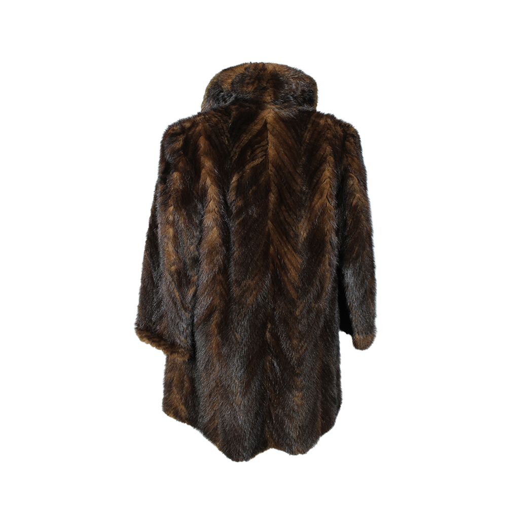 ELEGANTE PELLICCIA IN VISONE NATURALE MARRONE lavorazione disposta a motivo diagonale, collo tondo e chiusura frontale dorato decorativo. Interno foderato in seta marrone. Italia anni 70-80 h cm 105 x 50
