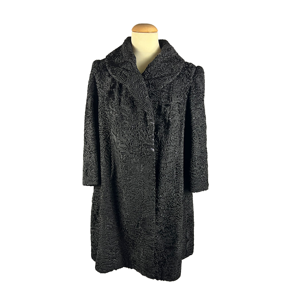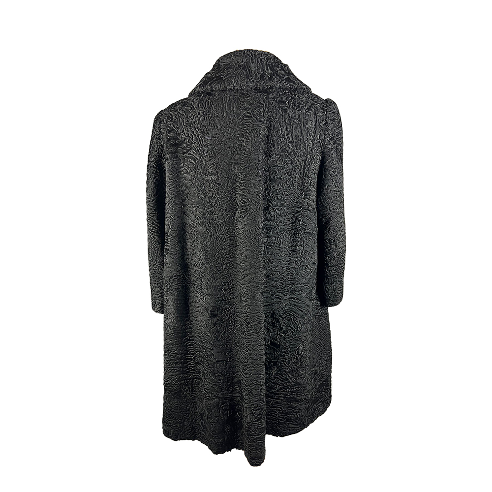 CAPPOTTO IN PELLICCIA DI ASTRAKAN NERO. TAGLIA IT 44/46 Collo ampio e maniche a 3/4 interno foderato in raso nero Italia anni 60-70