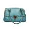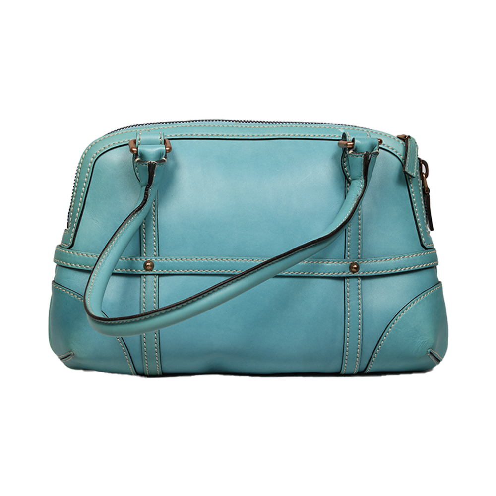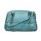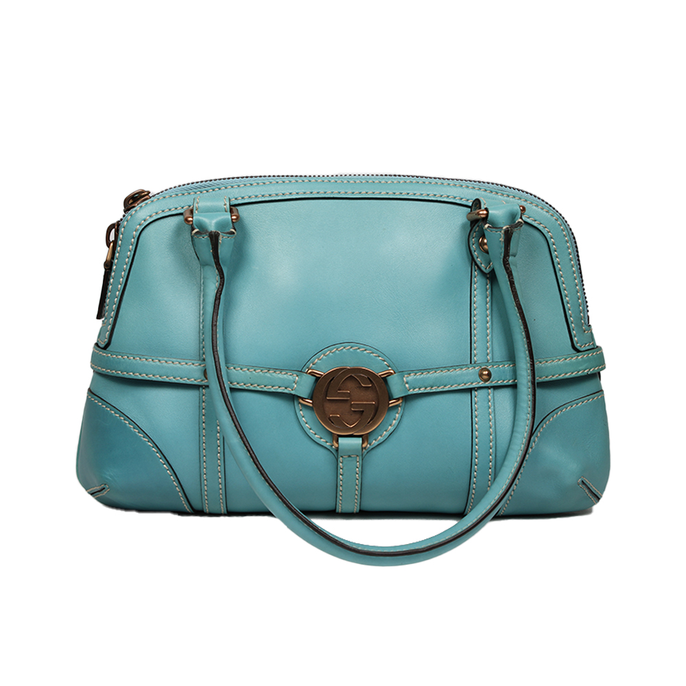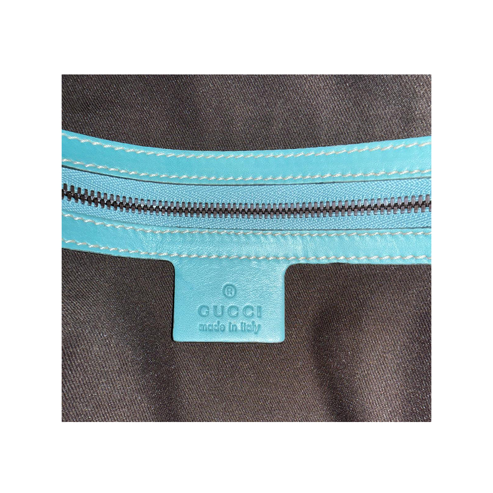 GUCCI, BORSA A MANO in pelle color turchese con cuciture a contrasto e logo frontale in metallo dorato satinato. Manici doppi chiusura superiore con Zip interno in tessuto marrone con tasca codice interno 114882-001998. corredata da sacca. Italia anni 2000 h cm 22 x 31