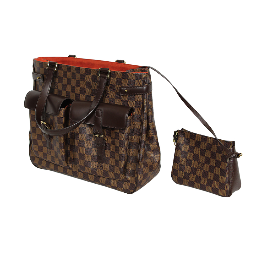 LOUIS VUITTON, BORSA IN TELA DAMIER ÉBÈNE , MODELLO TOTE BUSINESS con doppio manico due tasche frontali con pattine e chiusura a fibbia, ampia tasca interna con zip interno in alcantara color terra. Completa di pouch coordinata amovibile Francia anni 2000 h cm 30 x 34