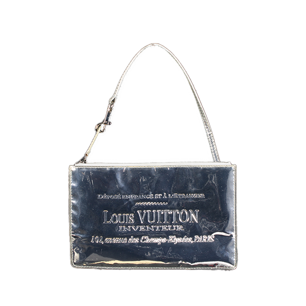 LOUIS VUITTON, POCHETTE MODELLO MIROIR in vernice metallizzata color argento con impresso il logo e diciture. Chiusura a zip superiore con cinturino da polso in pelle. Interno in tessuto chiaro. Codice interno (CA1006 LIMITE EDITINO IDEATA DA MAR JACOPO). Corredata da sacca originale. Made in Spain anno 2006 h cm 15 x 24