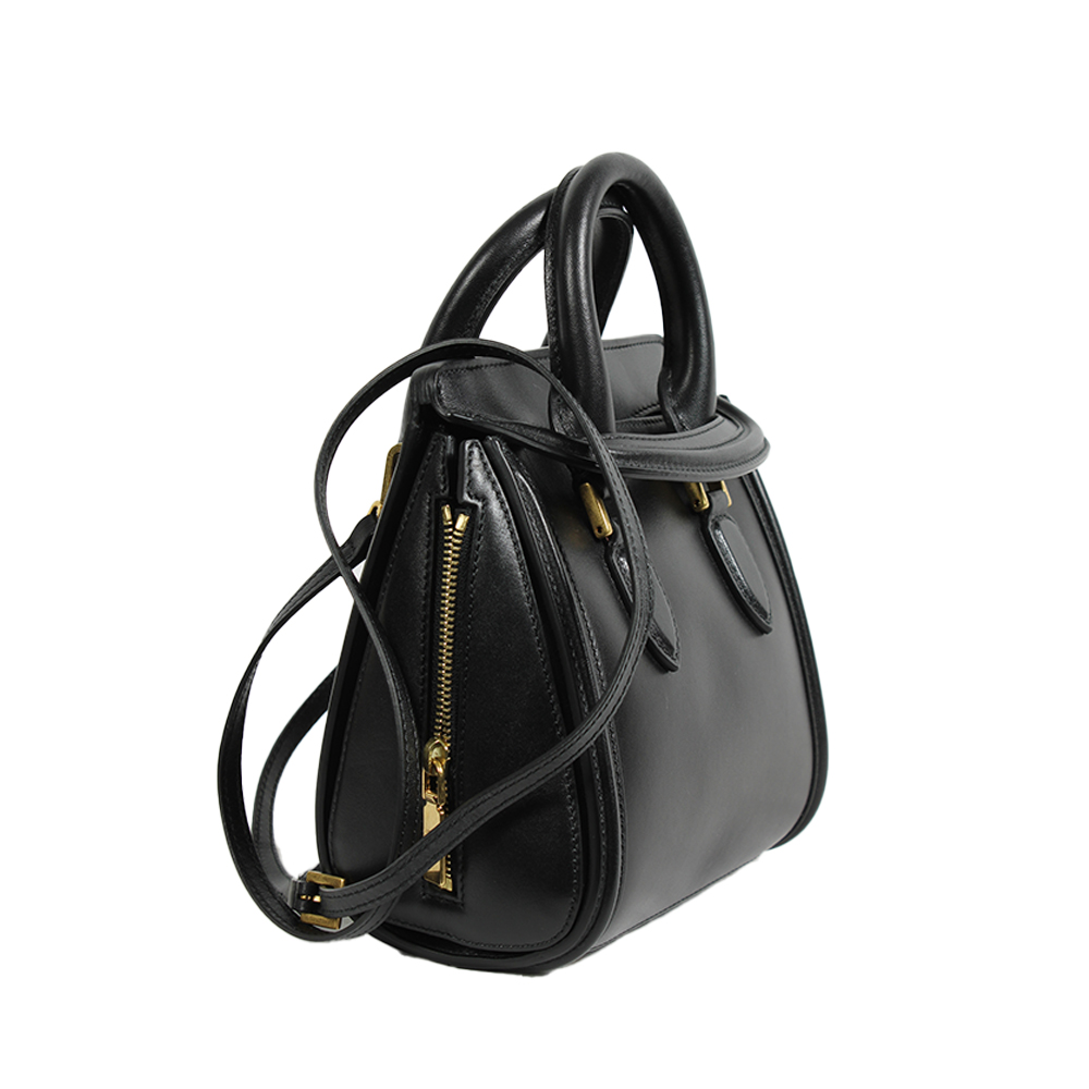 ALEXANDER MCQUEEN, BORSA MODELLO HEROINE in pelle nera con finiture dorate manici rigidi e tracolla regolabile e removibile, chiusura con zip laterali interno foderato in suede con tasca. Logo dorato impresso sul fronte e sulla ferramenta. Codice interno 544483-327950. corredato con sacca. Made in Italy h cm 21 x 19