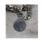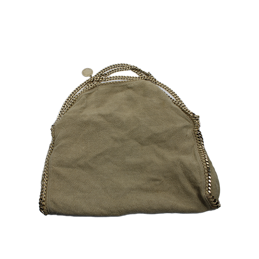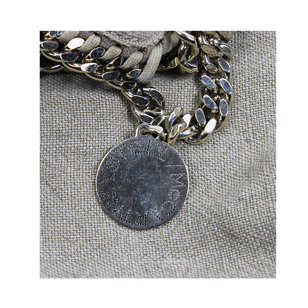 STELLA MCCARTNEY, BORSA MODELLO FALABELLA in tessuto beige con profili rifiniti da catena dorata intrecciata e doppi manici a catena medaglia tonda con logo. Interno foderato in raso color champagne con chiusura magnetica segni d'uso. h cm 40 x 41