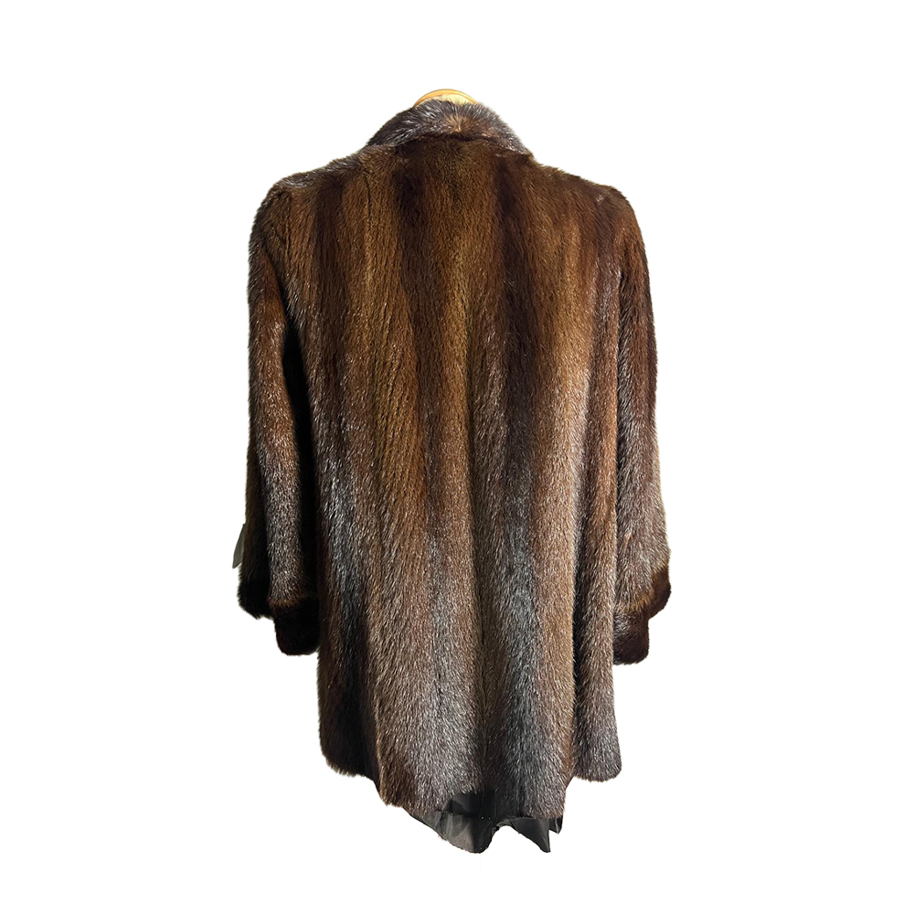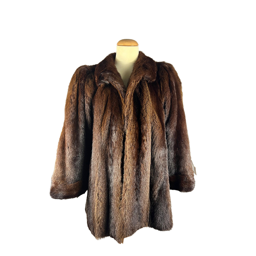 PELLICCIA IN VISONE FEMMINA TAGLIA IT 46/48 color mogano lavorazione verticale e collo a reverse maniche lunghe fodera interna in raso marrone Italia anni 70/80