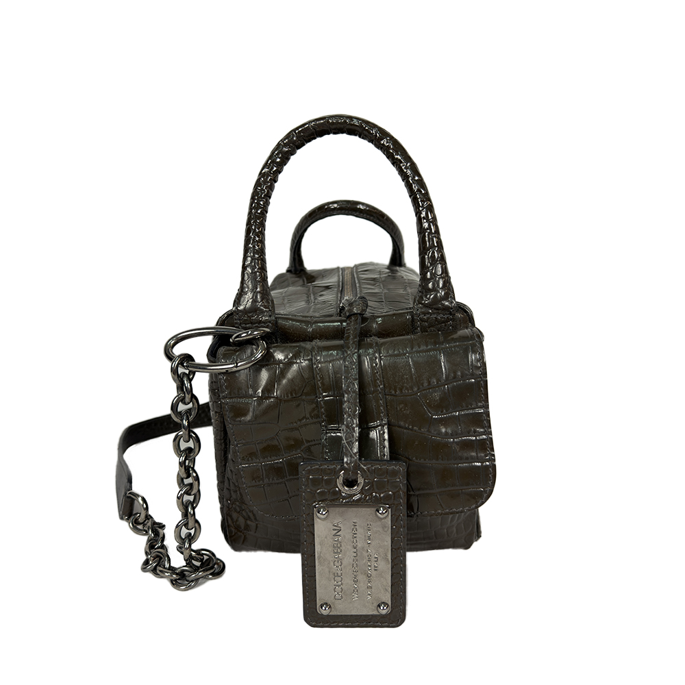 DOLCE & GABBANA, ELEGANTE BORSA A SPALLA realizzata in pelle con lavorazione stampata effetto coccodrillo lucida, colore nero fumo, dotata di doppi manici e tracolla removibile con catena in metallo brunito, chiusura superiore con zip e applicazione di placchetta logata e interno foderato. corredata da certificato di autenticità "card" h cm 17 x 33 x 22