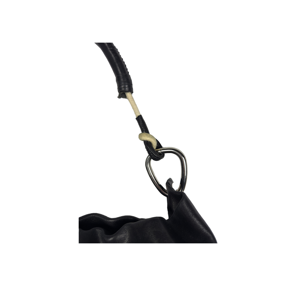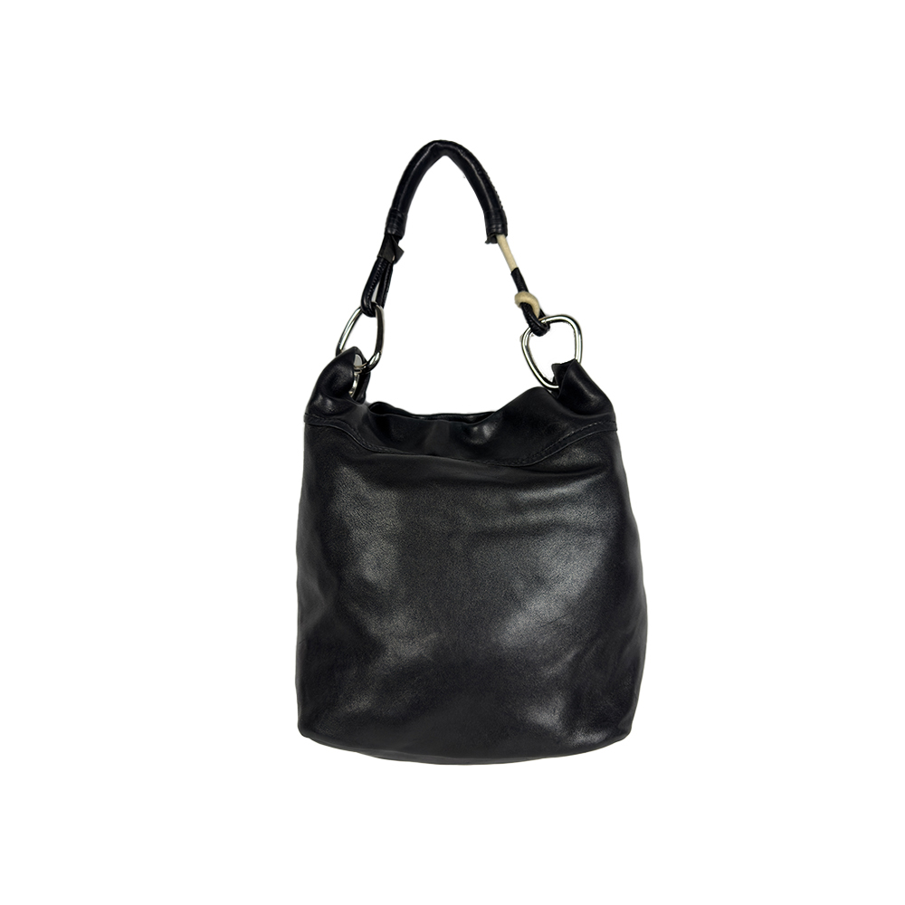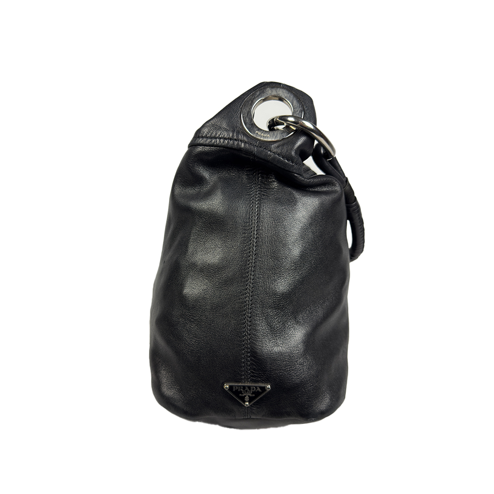 PRADA,BORSA VINTAGE A SPALLA HOBO BAG in pelle nera con anelli metallici, logo triangolare Prada in metallo smaltato sul fianco, Interno foderato in tessuto logato con tasca laterale e chiusura con bottone magnetico. Buone condizioni generali (tracolla da sistemare) Italia h cm 31 x 40 x 20