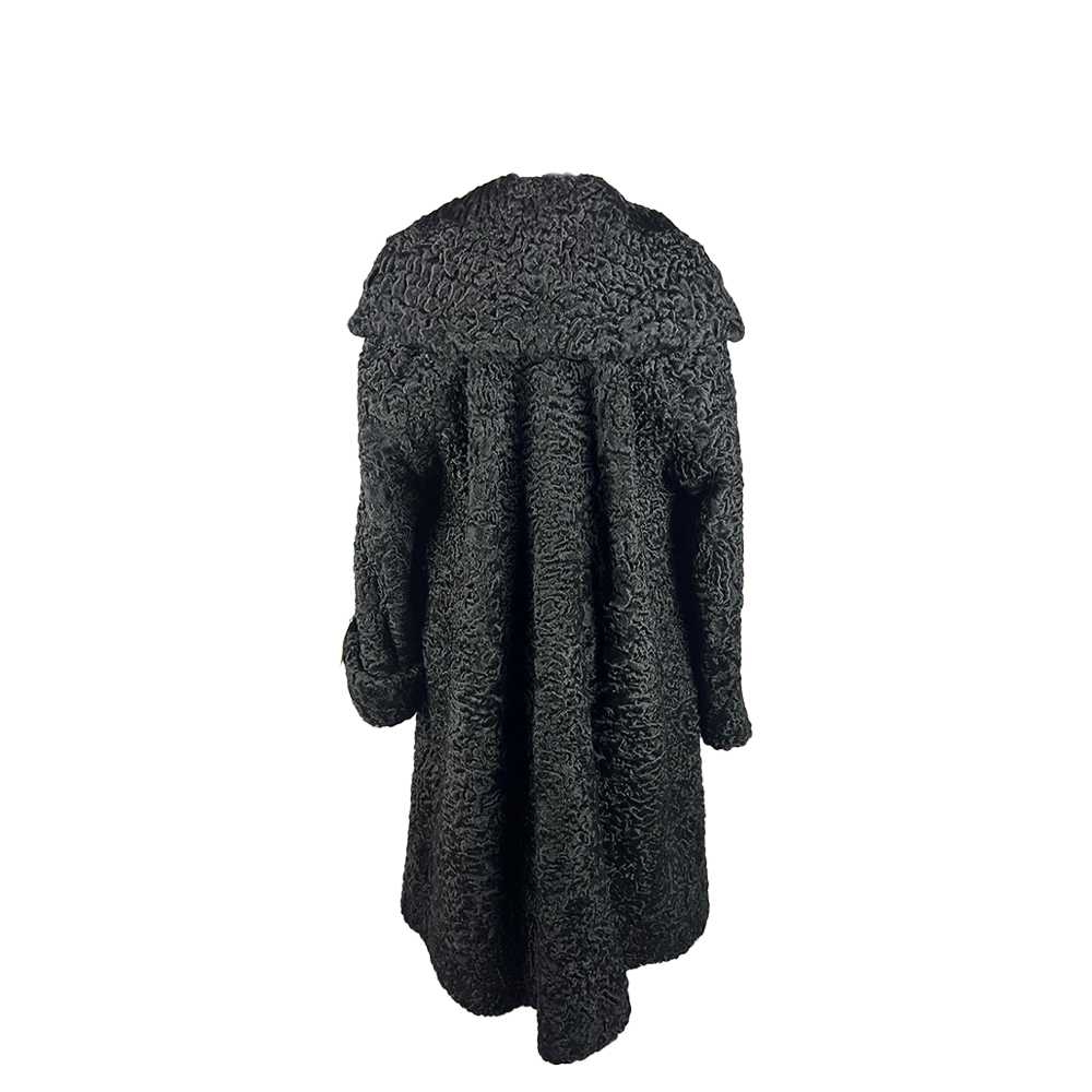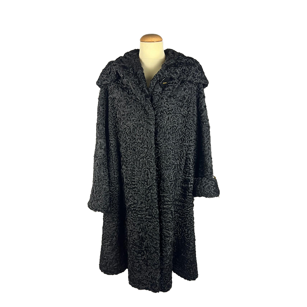 CAPPOTTO IN VERA PELLICCIA DI ASTRAKAN NERO TAGLIA IT 46/48 MODELLO LUNGO con ampio collo sciallato e maniche a risvolto interno in raso nero Italia anni 60/70
