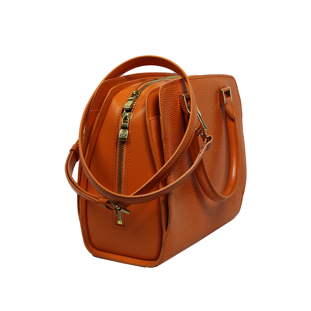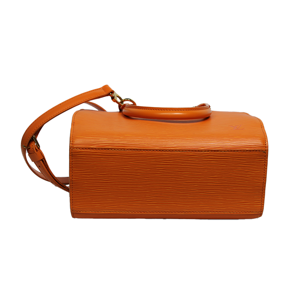 LOUIS VUITTON, BORSA in pelle epi arancione modello a doppio comparto con tasca centrale a zip manici rigidi e tracolla amovibile, interno in microfibra tono su tono. Ferramenta dorata Francia anni 200-2010 h cm 22 x 24,5