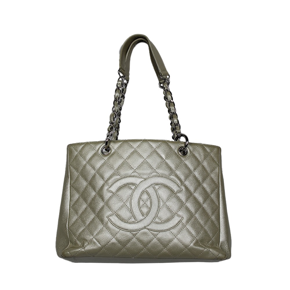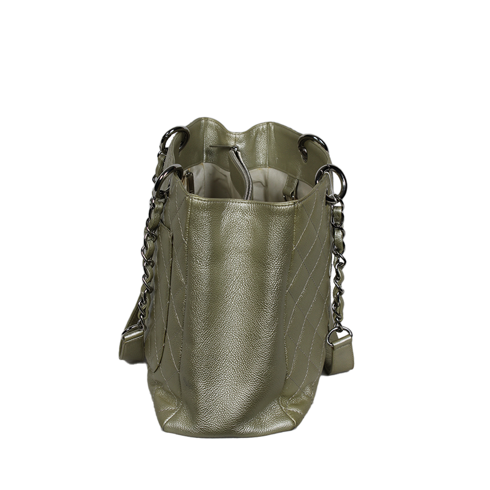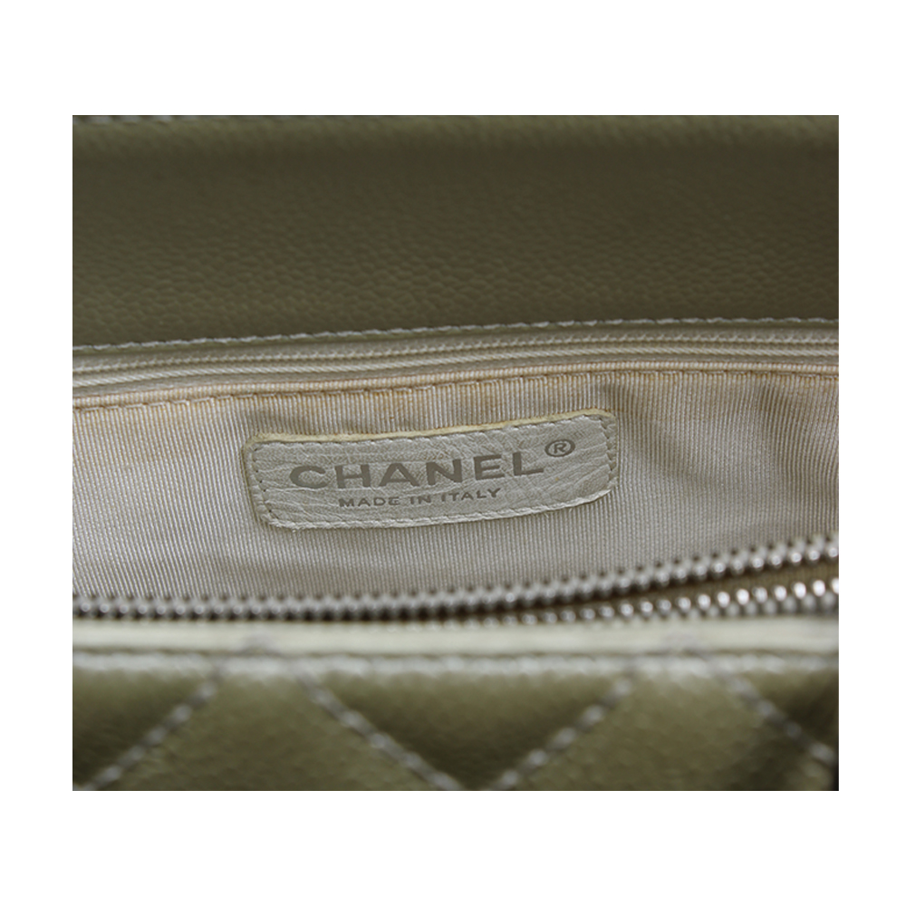 CHANEL, SHOPPING in pelle caviar color oro chiaro lavorazione matelassé, grande logo frontale impunturato doppi manici a catena con intreccio in pelle tasca esterna posteriore interno in tessuto chiaro con tasca a zip. Numero di serie 10270346 produzione Francia 2005/2006 h cm 24 x 36