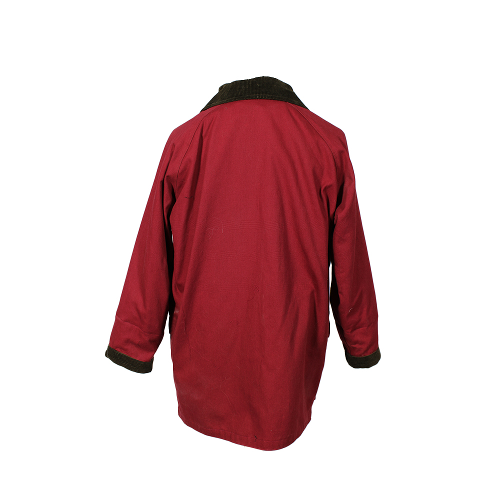 RARA GIACCA VINTAGE FIRMATA WEST BAND MARCHIO STATUNITENSE noto per abbigliamento da attività all'aria aperta, capo realizzato in robusto cotone canvas rosso con collo e polsini in velluto. Chiusura frontale con caratteristici ganci a moschettone. interno foderato in lana a fantasia tartan anni 70/80 Usa h cm 94 x 47