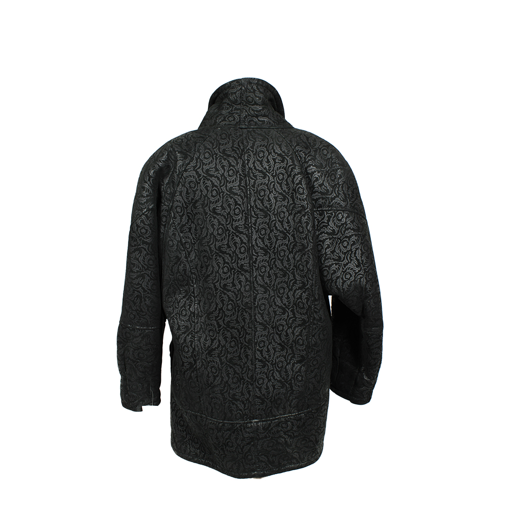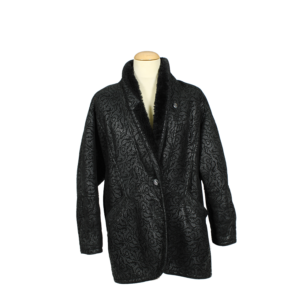 CAPPOTTO IN SHEARLING SHATYNS IN PELLE DI MONTONE TAGLIA IT 44/46 in pelle di montone rovesciato color nero , con lavorazione esterna goffrata a motivi floreali Europa anni 80/90