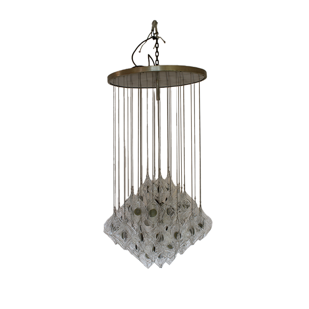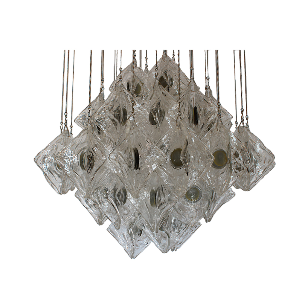 LAMPADARIO A SOSPENSIONE ANNI 60 attribuibile a J.T. Kalmar. Struttura composta da numerosi elementi modulari in vetro trasparente lavorato, difetti, Europa anni 60 h cm 120 x A 60